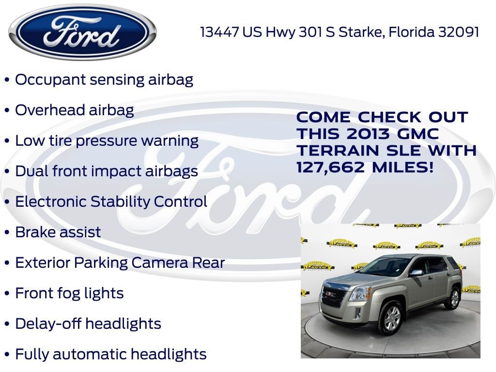 CARFAX One-Owner. Odometer is 1024 miles below market average! Murray Ford Superstore of Starke is pleased to offer this fantastic 2013 GMC Terrain in Champagne Silver Metallic This vehicle is readily available and comes with the following Chrome Package (Chrome Door Handles & Mirror Caps), Preferred Equipment Group 3SA (Single-Zone Manual Front Climate Control), 17 x 7.5 Painted Aluminum Wheels, 3.23 Axle Ratio, 4-Wheel Disc Brakes, 6 Speakers, ABS brakes, Air Conditioning, Alloy wheels, AM/FM radio: SiriusXM, Auto-dimming Rear-View mirror, Bluetooth® For Phone, Brake assist, Bumpers: body-color, CD player, Cloth Seat Trim, Compass, Delay-off headlights, Driver door bin, Driver vanity mirror, Dual front impact airbags, Dual front side impact airbags, E10 Fuel Capable, Electronic Stability Control, Emergency communication system: OnStar Directions & Connections, Exterior Parking Camera Rear, Four wheel independent suspension, Front anti-roll bar, Front Bucket Seats, Front Center Armrest, Front fog lights, Front reading lights, Fully automatic headlights, Heated door mirrors, Illuminated entry, Low tire pressure warning, Occupant sensing airbag, Outside temperature display, Overhead airbag, Panic alarm, Passenger door bin, Passenger vanity mirror, Power door mirrors, Power driver seat, Power steering, Power windows, Radio data system, Radio: Color Touch AM/FM Stereo w/CD Player, Rear anti-roll bar, Rear seat center armrest, Rear window defroster, Rear window wiper, Remote keyless entry, Security system, SIRIUSXM Satellite Radio, Speed control, Speed-sensing steering, Split folding rear seat, Spoiler, Steering wheel mounted audio controls, Tachometer, Telescoping steering wheel, Tilt steering wheel, Traction control, Trip computer, and Variably intermittent wipers;