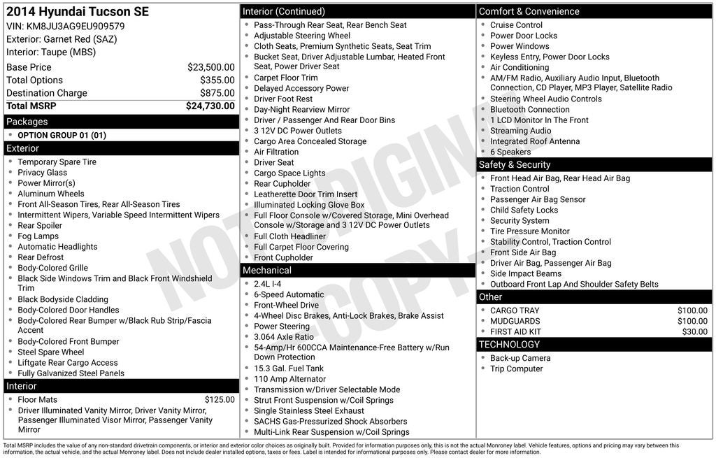 Murray Ford Superstore of Starke is pumped up to offer this great 2014 Hyundai Tucson in Garnet Red This vehicle is readily available and comes with the following Option Group 01, 17 x 6.5 Alloy Wheels, 3.064 Axle Ratio, 4-Wheel Disc Brakes, 6 Speakers, ABS brakes, Air Conditioning, Alloy wheels, AM/FM radio: SiriusXM, Anti-whiplash front head restraints, Brake assist, Bumpers: body-color, Cargo Tray, Carpeted Floor Mats, CD player, Cloth Seat Insert w/Leatherette Bolster, Delay-off headlights, Driver door bin, Driver vanity mirror, Dual front impact airbags, Dual front side impact airbags, Electronic Stability Control, Exterior Parking Camera Rear, First Aid Kit, Four wheel independent suspension, Front anti-roll bar, Front Bucket Seats, Front Center Armrest, Front fog lights, Front reading lights, Fully automatic headlights, Heated Front Bucket Seats, Heated front seats, Illuminated entry, Low tire pressure warning, Mudguards, Occupant sensing airbag, Overhead airbag, Overhead console, Panic alarm, Passenger door bin, Passenger vanity mirror, Power door mirrors, Power driver seat, Power steering, Power windows, Radio: Autonet AM/FM/CD/MP3 Audio System, Rear anti-roll bar, Rear seat center armrest, Rear window defroster, Rear window wiper, Remote keyless entry, Roof rack: rails only, Security system, Speed control, Speed-sensing steering, Split folding rear seat, Spoiler, Steering wheel mounted audio controls, Tachometer, Telescoping steering wheel, Tilt steering wheel, Traction control, Trip computer, and Variably intermittent wipers;