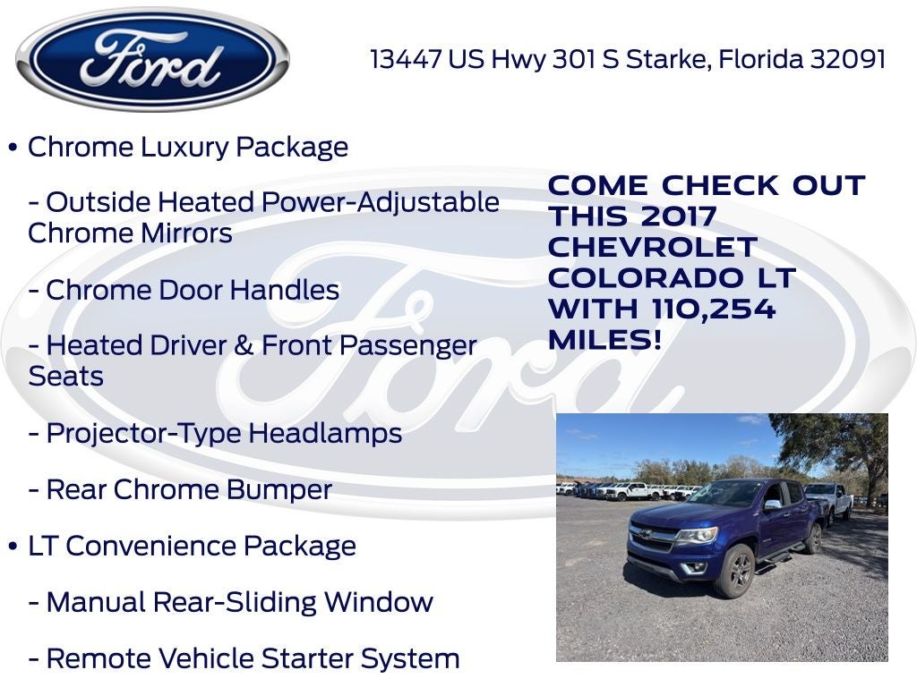 Recent Arrival! Priced below KBB Fair Purchase Price! Murray Ford Superstore of Starke is excited to offer this great-looking 2017 Chevrolet Colorado in Laser Blue Metallic This vehicle is readily available and comes with the following Black Bowtie Emblem Package (LPO), Chrome Luxury Package (4-Way Power Front Passenger Seat Adjuster, Chrome Door Handles, Heated Driver & Front Passenger Seats, Inside Rear-View Auto-Dimming Mirror, Outside Heated Power-Adjustable Chrome Mirrors, Power Driver Lumbar Control Seat Adjuster, Power Passenger Lumbar Control Seat Adjuster, Projector-Type Headlamps, Rear Chrome Bumper, and Single-Zone Auto Climate Control Air Conditioning), Heavy-Duty Trailering Package, LT Convenience Package (EZ-Lift & Lower Tailgate, Front Fog Lamps, Manual Rear-Sliding Window, Rear-Window Electric Defogger, and Remote Vehicle Starter System), Preferred Equipment Group 4LT, Safety Package (Forward Collision Alert and Lane Departure Warning System), 4WD, 3.42 Rear Axle Ratio, 3 Round Black Off-Road Step Bars (LPO), 4-Wheel Disc Brakes, 6 Speakers, 6-Speaker Audio System Feature, ABS brakes, Air Conditioning, Alloy wheels, AM/FM radio: SiriusXM, Apple CarPlay, Automatic Locking Rear Differential, Black Spray-On Bedliner w/Chevrolet Logo, Bose Premium 7-Speaker Audio System Feature, Bumpers: body-color, Cloth Seat Trim, Compass, Delay-off headlights, Driver 4-Way Power Seat Adjuster, Driver door bin, Driver vanity mirror, Dual front impact airbags, Dual front side impact airbags, Electronic Stability Control, Emergency communication system: OnStar Guidance, Exhaust Brake, Exterior Parking Camera Rear, Front anti-roll bar, Front Bucket Seats, Front Center Armrest, Front reading lights, Front wheel independent suspension, Fully automatic headlights, Illuminated entry, Integrated Trailer Brake Controller, Low tire pressure warning, Occupant sensing airbag, Outside temperature display, Overhead airbag, Overhead console, Panic alarm, Passenger door bin, Passenger vanity mirror, Power door mirrors, Power driver seat, Power steering, Power windows, Premium audio system: Chevrolet MyLink, Radio data system, Radio: AM/FM Stereo w/8 Diagonal Color Touch Nav., Radio: AM/FM Stereo w/8 Diagonal Color Touch Screen, Rear reading lights, Rear seat center armrest, Rear step bumper, Remote keyless entry, Security system, SiriusXM Satellite Radio, Speed control, Speed-sensing steering, Steering wheel mounted audio controls, Tachometer, Telescoping steering wheel, Tilt steering wheel, Traction control, Trip computer, Variably intermittent wipers, Wheels: 17 x 8 Blade Silver Metallic Cast Alloy, and Wheels: 18 x 8.5 Dark Argent Metallic Cast Alloy;