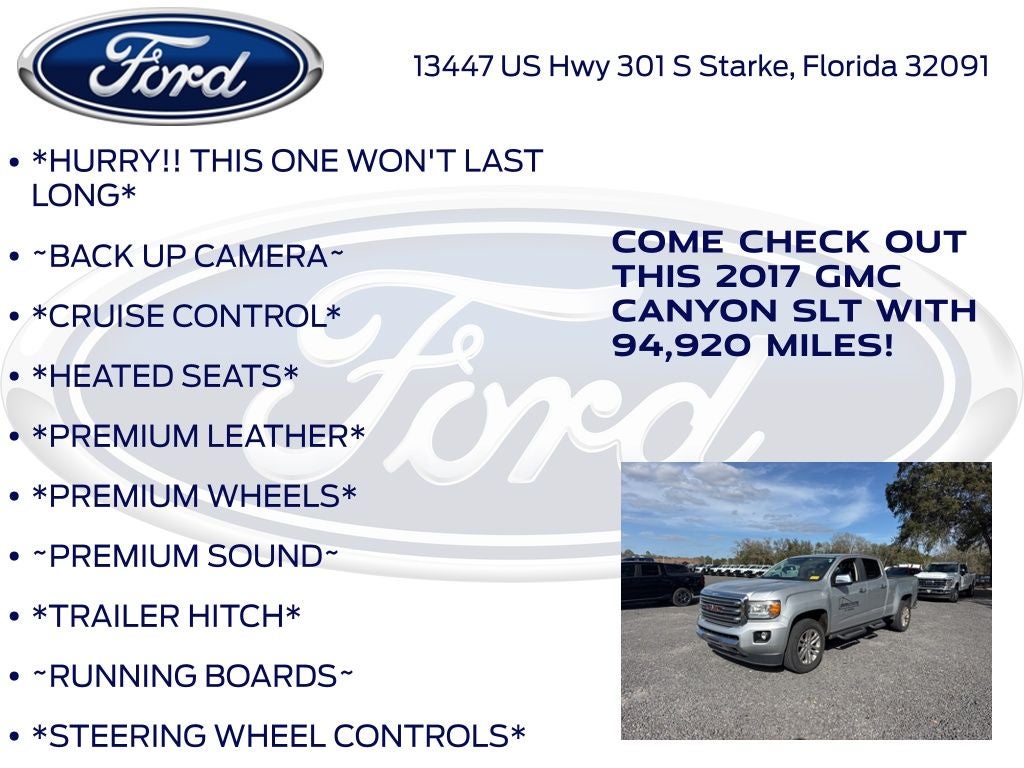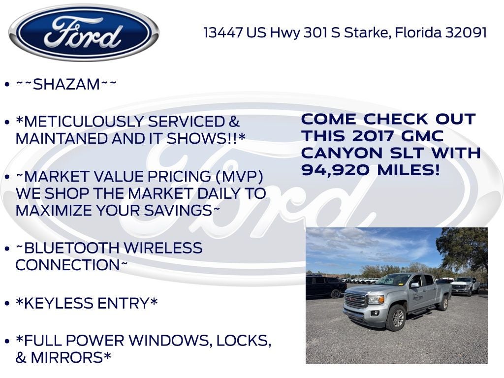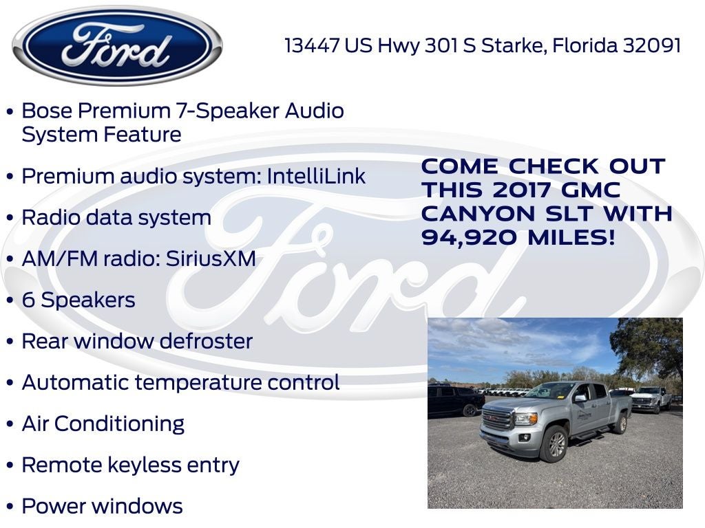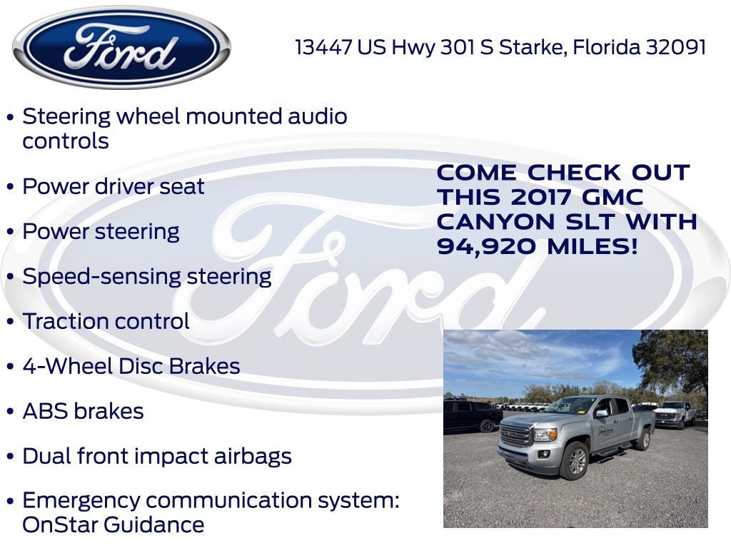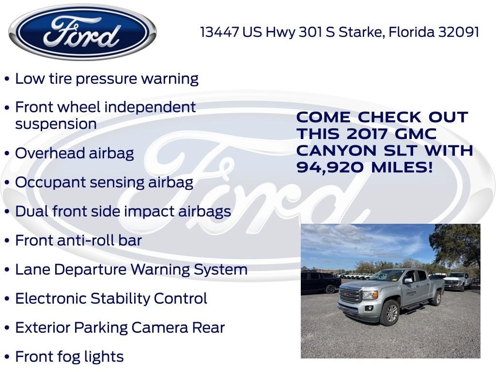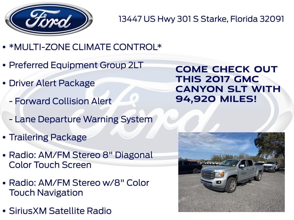 Recent Arrival! Priced below KBB Fair Purchase Price! Murray Ford Superstore of Starke is proud to offer this good-looking 2017 GMC Canyon in Quicksilver Metallic This vehicle is readily available and comes with the following Driver Alert Package (Forward Collision Alert and Lane Departure Warning System), Preferred Equipment Group 2LT, Trailering Package, 3.42 Rear Axle Ratio, 3 Round Black Off-Road Step Bars (LPO), 4-Wheel Disc Brakes, 6 Speakers, ABS brakes, Air Conditioning, All-Weather Floor Liner (LPO), Alloy wheels, AM/FM radio: SiriusXM, Auto-dimming Rear-View mirror, Automatic temperature control, Black Spray-On Bedliner w/GMC Logo, Bose Premium 7-Speaker Audio System Feature, Bumpers: body-color, Cargo Tie-Down Rings (Set of 4) (LPO), Compass, Delay-off headlights, Driver door bin, Driver vanity mirror, Dual front impact airbags, Dual front side impact airbags, Electronic Stability Control, Emergency communication system: OnStar Guidance, Exhaust Brake, Exterior Parking Camera Rear, Front anti-roll bar, Front Bucket Seats, Front Center Armrest, Front fog lights, Front reading lights, Front wheel independent suspension, Fully automatic headlights, Heated door mirrors, Heated front seats, Illuminated entry, Integrated Trailer Brake Controller, Leather-Appointed Seat Trim, Low tire pressure warning, Occupant sensing airbag, Outside temperature display, Overhead airbag, Overhead console, Panic alarm, Passenger door bin, Passenger vanity mirror, Power door mirrors, Power driver seat, Power passenger seat, Power steering, Power windows, Premium audio system: IntelliLink, Radio data system, Radio: AM/FM Stereo 8 Diagonal Color Touch Screen, Radio: AM/FM Stereo w/8 Color Touch Navigation, Rear reading lights, Rear seat center armrest, Rear step bumper, Rear window defroster, Remote keyless entry, Security system, SiriusXM Satellite Radio, Speed control, Speed-sensing steering, Steering wheel mounted audio controls, Tachometer, Techno Steel Interior Trim Kit (LPO), Telescoping steering wheel, Tilt steering wheel, Traction control, Trip computer, Variably intermittent wipers, and Wheels: 18 x 8.5 Polished Cast Aluminum;