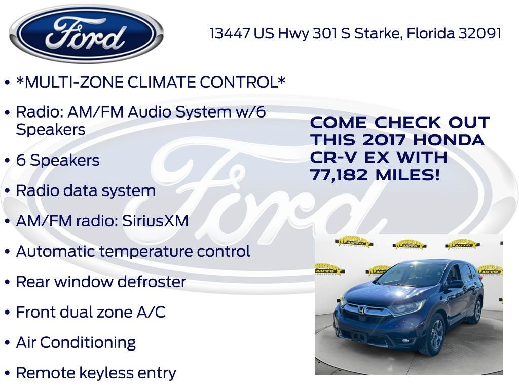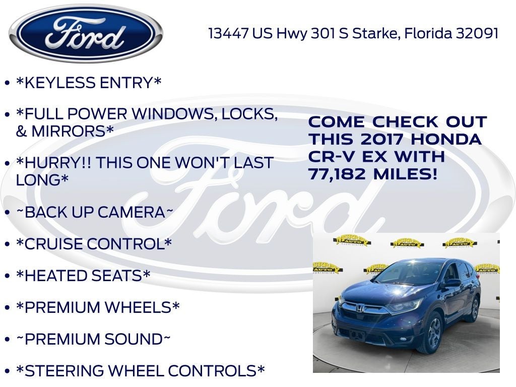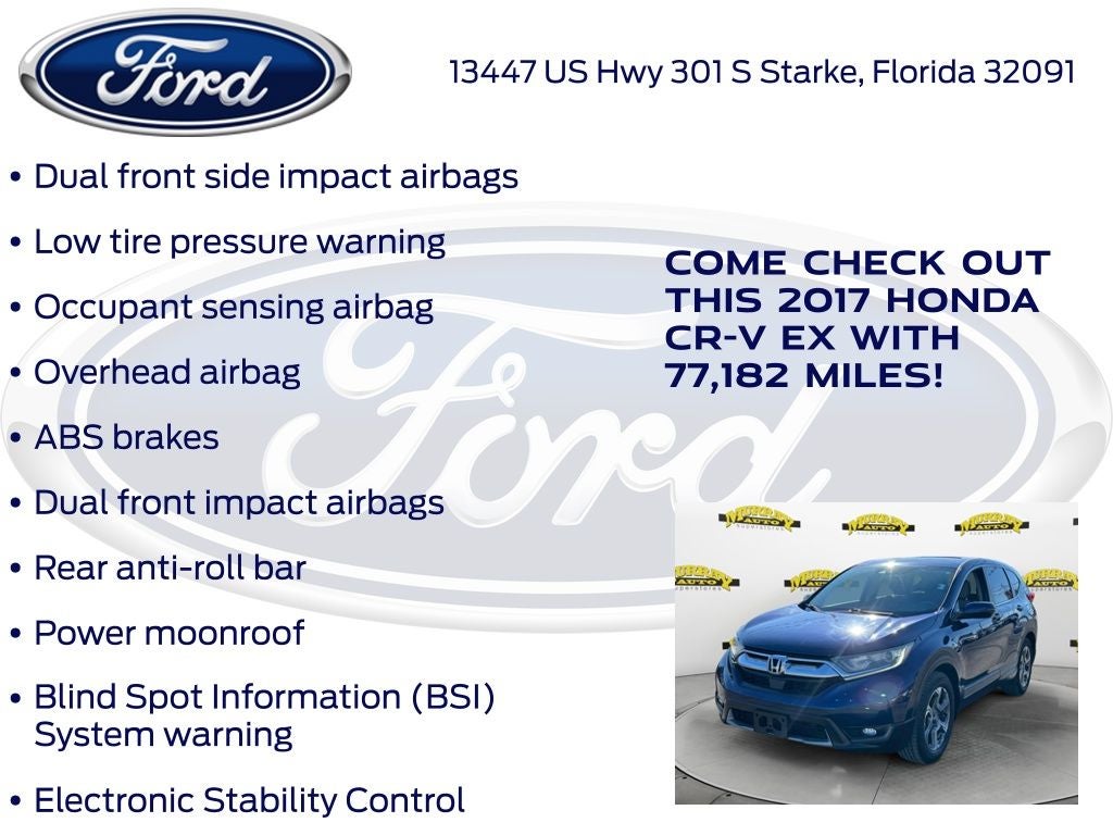 CARFAX One-Owner. Odometer is 17034 miles below market average! Murray Ford Superstore of Starke is pleased to offer this terrific 2017 Honda CR-V in Blue This vehicle is readily available and comes with the following 18 Alloy Wheels, 4-Wheel Disc Brakes, 5.64 Axle Ratio, 6 Speakers, ABS brakes, Air Conditioning, Alloy wheels, AM/FM radio: SiriusXM, Apple CarPlay/Android Auto, Auto High-beam Headlights, Automatic temperature control, Blind Spot Information (BSI) System warning, Brake assist, Bumpers: body-color, Cloth Seat Trim, Compass, Delay-off headlights, Driver door bin, Driver vanity mirror, Dual front impact airbags, Dual front side impact airbags, Electronic Stability Control, Exterior Parking Camera Rear, Four wheel independent suspension, Front anti-roll bar, Front Bucket Seats, Front Center Armrest, Front dual zone A/C, Front fog lights, Front reading lights, Fully automatic headlights, Heated door mirrors, Heated Front Bucket Seats, Heated front seats, Illuminated entry, Low tire pressure warning, Occupant sensing airbag, Outside temperature display, Overhead airbag, Overhead console, Panic alarm, Passenger door bin, Passenger vanity mirror, Power door mirrors, Power driver seat, Power moonroof, Power steering, Power windows, Radio data system, Radio: AM/FM Audio System w/6 Speakers, Rear anti-roll bar, Rear seat center armrest, Rear window defroster, Rear window wiper, Remote keyless entry, Security system, Speed control, Speed-sensing steering, Speed-Sensitive Wipers, Split folding rear seat, Spoiler, Steering wheel mounted audio controls, Tachometer, Telescoping steering wheel, Tilt steering wheel, Traction control, Trip computer, Turn signal indicator mirrors, and Variably intermittent wipers;
