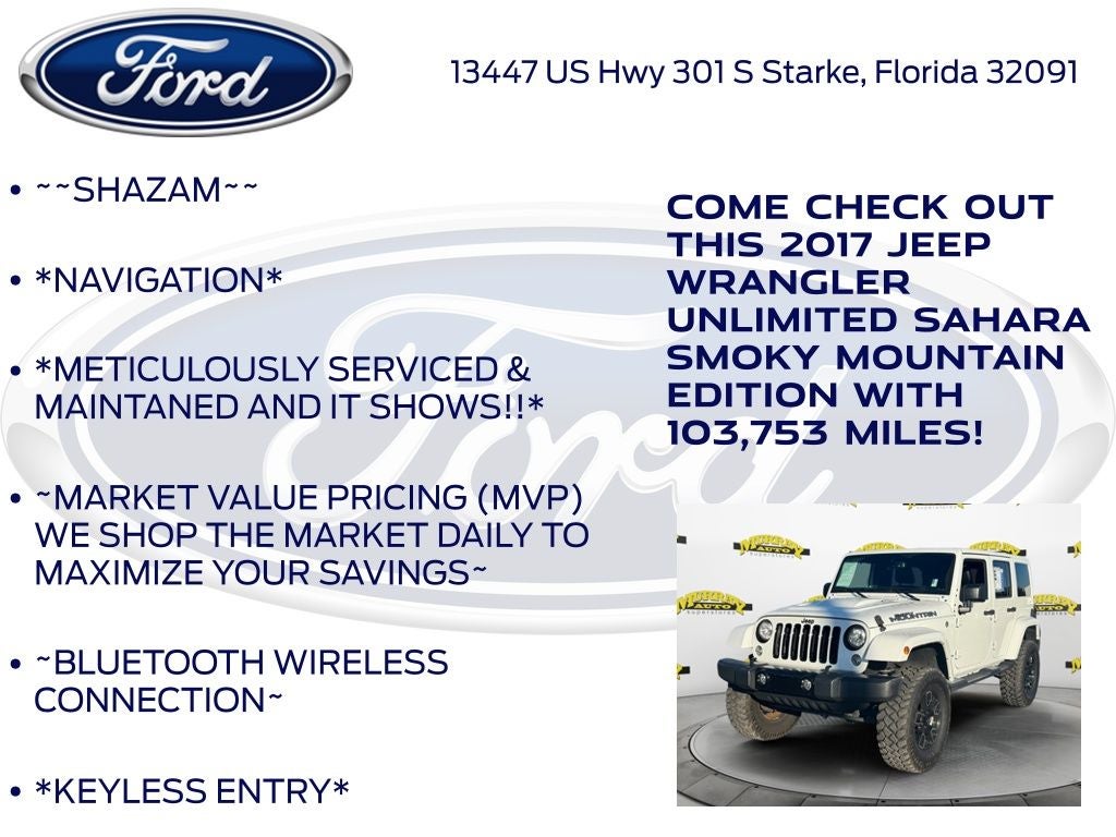 Murray Ford Superstore of Starke is pumped up to offer this good-looking and fun 2017 Jeep Wrangler in Bright White Clearcoat This vehicle is readily available and comes with the following Connectivity Group (Remote USB Port, Tire Pressure Monitoring Display, Uconnect Voice Command w/Bluetooth®, and Vehicle Information Center), Quick Order Package 24Y Smoky Mountain (DISC) (Black Accent Stitching, Black Fuel Filler Door, Body Color 3-Piece Hard Top, Body Color Grille w/Black Accents, Delete Sahara Badge, Freedom Panel Storage Bag, Gloss Black Fascia Applique, Glossy Black Jeep Badge, Heated Front Seats, Hood w/Power Bulge, JK Smoky Mountain Hood Decals, Low Gloss Black Wrangler Decal, Midnight Star Interior Accents, Millennium Fabric Sport Bar Cover, MOPAR Black Tail Lamp Guards, MOPAR Coat Hooks & Grab Handles, Rear Window Defroster, Rear Window Wiper/Washer, Smoky Mountain Edition, and Wheels: 18 x 7.5 High Gloss Blk Polished (DISC)), 18 x 7.5 Polished Satin Carbon Wheels, 3.21 Rear Axle Ratio, 4-Wheel Disc Brakes, 40GB Hard Drive w/28GB Available, 5-Year SiriusXM Travel Link Service, 6.5 Touchscreen Display, 8 Speakers, ABS brakes, Air Conditioning, Alloy wheels, AM/FM radio: SiriusXM, Audio Jack Input for Mobile Devices, Auto-dimming Rear-View mirror, Brake assist, CD player, Cloth Seats w/Adjustable Head Restraints, Compass, Driver door bin, Driver vanity mirror, Dual front impact airbags, Electronic Stability Control, Front anti-roll bar, Front Bucket Seats, Front Center Armrest w/Storage, Front fog lights, Front reading lights, Fully automatic headlights, GPS Navigation, Heated door mirrors, Heavy Duty Suspension w/Gas Shocks (DISC), Illuminated entry, Integrated roll-over protection, Leather steering wheel, Low tire pressure warning, MOPAR Slush Mats, Occupant sensing airbag, Outside temperature display, Panic alarm, Passenger door bin, Passenger vanity mirror, Power door mirrors, Power steering, Power windows, Radio data system, Radio: 130, Radio: 430 Nav, Radio: 430N (DISC), Rear anti-roll bar, Remote keyless entry, Remote Start System, Security system, SiriusXM Travel Link, Speed control, Split folding rear seat, Steering wheel mounted audio controls, Tachometer, Tilt steering wheel, Traction control, Trip computer, and Variably intermittent wipers;