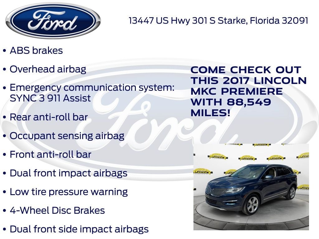 Murray Ford Superstore of Starke is proud to offer this good-looking 2017 Lincoln MKC in Sapphire Blue Metallic This vehicle is readily available and comes with the following Equipment Group 100A Premiere, 10 Speakers, 18 Painted Aluminum Wheels, 3.36 Axle Ratio, 4-Wheel Disc Brakes, ABS brakes, Air Conditioning, Alloy wheels, AM/FM radio: SiriusXM, Auto-dimming Rear-View mirror, Automatic temperature control, Brake assist, Bumpers: body-color, CD player, Compass, Delay-off headlights, Driver door bin, Driver vanity mirror, Dual front impact airbags, Dual front side impact airbags, Electronic Stability Control, Emergency communication system: SYNC 3 911 Assist, Exterior Parking Camera Rear, Four wheel independent suspension, Front anti-roll bar, Front Bucket Seats, Front Center Armrest, Front dual zone A/C, Front reading lights, Fully automatic headlights, Heated door mirrors, Heated front seats, Heated Soft Touch Bucket Seats, High-Intensity Discharge Headlights, Illuminated entry, Knee airbag, Low tire pressure warning, Memory seat, Occupant sensing airbag, Outside temperature display, Overhead airbag, Overhead console, Panic alarm, Passenger door bin, Passenger vanity mirror, Power door mirrors, Power driver seat, Power Liftgate, Power passenger seat, Power steering, Power windows, Radio data system, Radio: Audio System w/CD/MP3, Rear anti-roll bar, Rear Parking Sensors, Rear reading lights, Rear seat center armrest, Rear window defroster, Rear window wiper, Remote keyless entry, Roof rack: rails only, Security system, SiriusXM Satellite Radio, Speed control, Speed-sensing steering, Speed-Sensitive Wipers, Split folding rear seat, Spoiler, Steering wheel mounted audio controls, SYNC 3 Communications & Entertainment System, Tachometer, Telescoping steering wheel, Tilt steering wheel, Traction control, Trip computer, and Variably intermittent wipers;