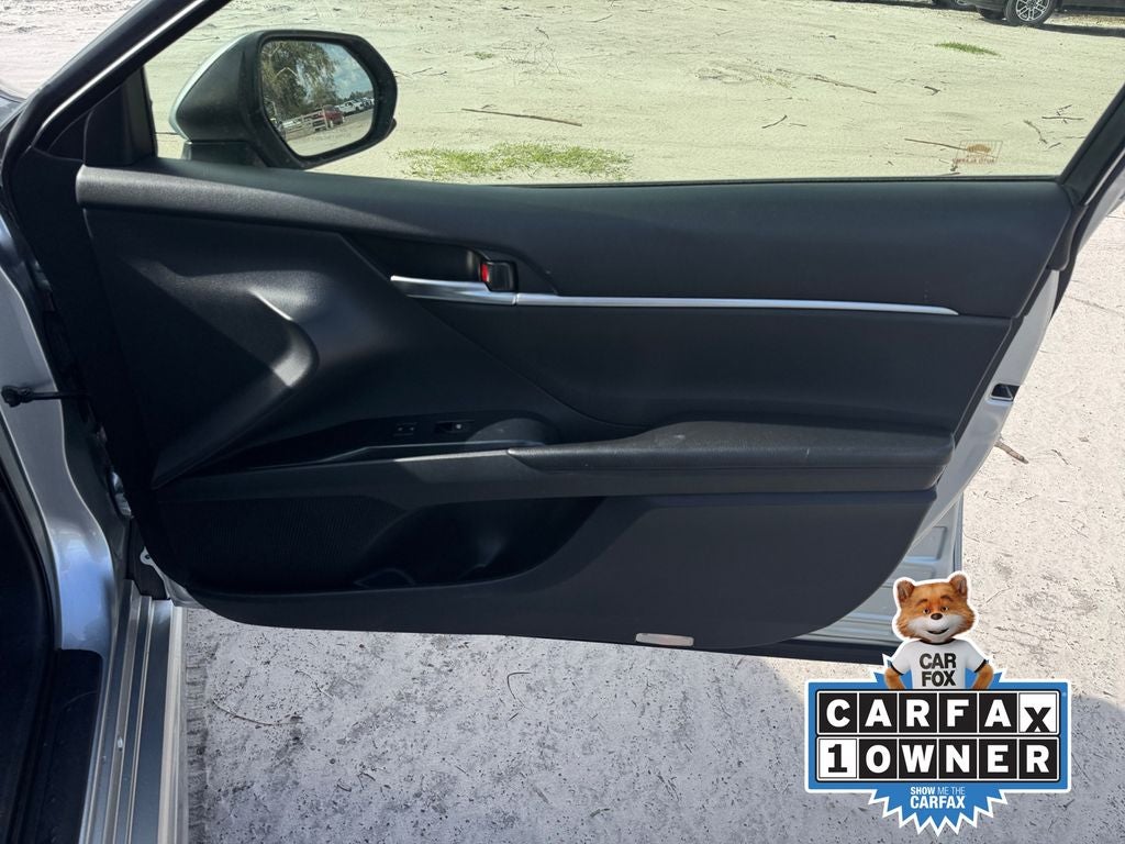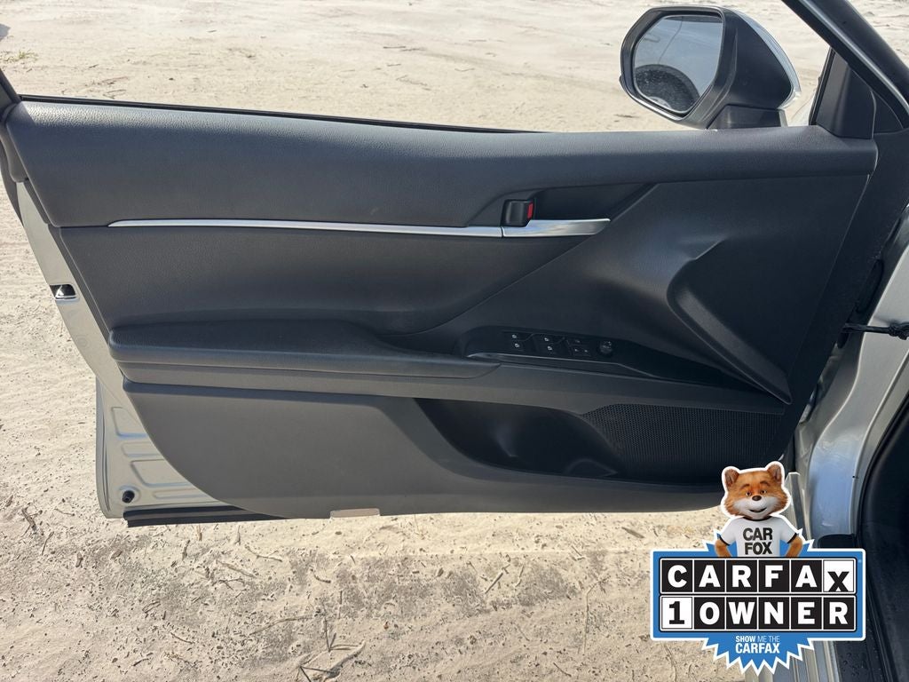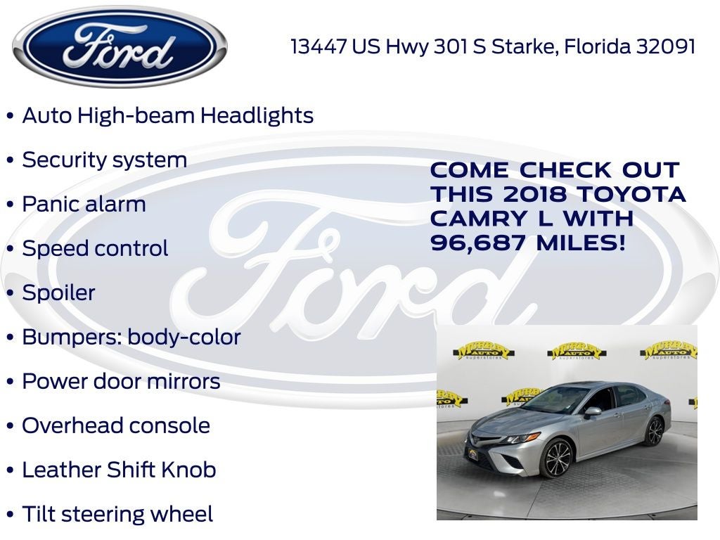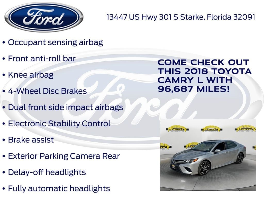 Recent Arrival! CARFAX One-Owner. Odometer is 14831 miles below market average! Murray Ford Superstore of Starke is very proud to offer this outstanding 2018 Toyota Camry in Celestial Silver Metallic This vehicle is readily available and comes with the following Black w/Fabric Seat Trim, 4-Wheel Disc Brakes, 6 Speakers, ABS brakes, Air Conditioning, AM/FM radio, Auto High-beam Headlights, Brake assist, Bumpers: body-color, Delay-off headlights, Driver door bin, Driver vanity mirror, Dual front impact airbags, Dual front side impact airbags, Electronic Stability Control, Exterior Parking Camera Rear, Four wheel independent suspension, Front anti-roll bar, Front Bucket Seats, Front Center Armrest, Front reading lights, Fully automatic headlights, Illuminated entry, Knee airbag, Low tire pressure warning, Occupant sensing airbag, Outside temperature display, Overhead airbag, Overhead console, Panic alarm, Passenger door bin, Passenger vanity mirror, Power door mirrors, Power steering, Power windows, Radio data system, Radio: Entune 3.0 Audio, Rear anti-roll bar, Rear reading lights, Rear side impact airbag, Rear window defroster, Remote keyless entry, Speed control, Speed-sensing steering, Steering wheel mounted audio controls, Tachometer, Telescoping steering wheel, Tilt steering wheel, Traction control, Trip computer, and Variably intermittent wipers;