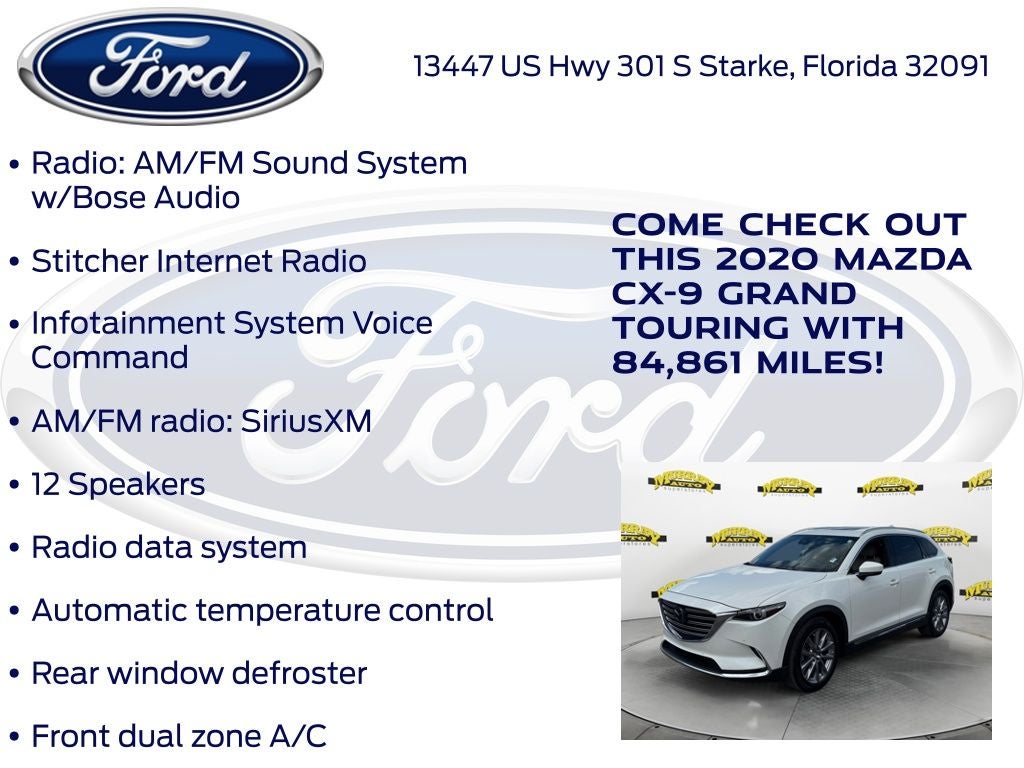 Recent Arrival! Murray Ford Superstore of Starke is excited to offer this outstanding-looking 2020 Mazda CX-9 in Snowflake White Pearl Mica This vehicle is readily available and comes with the following Ford Blue Advantage: Blue Certified Certified, 12 Speakers, 3rd row seats: bench, 4-Wheel Disc Brakes, ABS brakes, Aha Internet Radio, Air Conditioning, Alloy wheels, AM/FM radio: SiriusXM, AppLink/Apple CarPlay and Android Auto, Auto High-beam Headlights, Auto-dimming Rear-View mirror, Automatic temperature control, Axle Ratio: 4.411, Brake assist, Bumpers: body-color, Compass, Delay-off headlights, Driver door bin, Driver vanity mirror, Dual front impact airbags, Dual front side impact airbags, E911 Automatic Emergency Notification, Electronic Stability Control, Emergency communication system: MAZDA CONNECT, Four wheel independent suspension, Front anti-roll bar, Front Bucket Seats, Front Center Armrest, Front dual zone A/C, Front fog lights, Front reading lights, Fully automatic headlights, Garage door transmitter: HomeLink, Heads-Up Display, Heated door mirrors, Heated front seats, Heated rear seats, Heated steering wheel, Heated/Ventilated Front Bucket Seats, Illuminated entry, Infotainment System Voice Command, Leather Shift Knob, Leather steering wheel, Leather-Trimmed Seats, Low tire pressure warning, Mazda Navigation System, Memory seat, Navigation System, Occupant sensing airbag, Outside temperature display, Overhead airbag, Overhead console, Pandora Internet Radio, Panic alarm, Passenger door bin, Passenger vanity mirror, Power door mirrors, Power driver seat, Power Liftgate, Power moonroof, Power passenger seat, Power steering, Power windows, Radio Broadcast Data System Program Information, Radio data system, Radio: AM/FM Sound System w/Bose Audio, Rain sensing wipers, Rear air conditioning, Rear anti-roll bar, Rear reading lights, Rear seat center armrest, Rear window defroster, Rear window wiper, Remote keyless entry, Roof rack: rails only, SiriusXM Satellite Radio, SMS Text Msg Audio Delivery & Reply, Snowflake White Pearl Mica Paint, Speed control, Speed-sensing steering, Split folding rear seat, Spoiler, Steering wheel mounted audio controls, Stitcher Internet Radio, Tachometer, Telescoping steering wheel, Tilt steering wheel, Traction control, Trip computer, Turn signal indicator mirrors, Variably intermittent wipers, Ventilated front seats, and Wheels: 20 x 8.5J Aluminum Alloy;