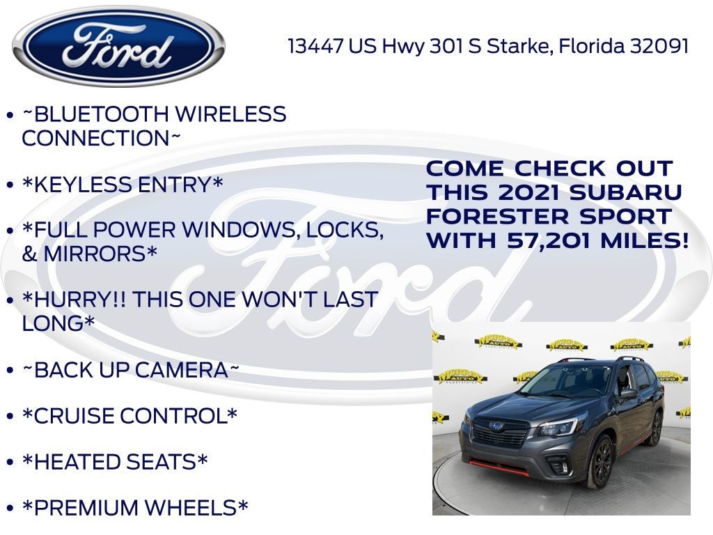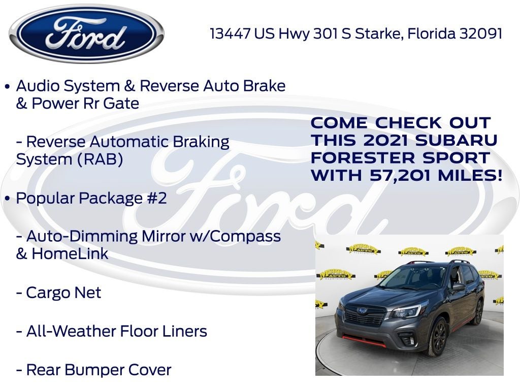 Priced below KBB Fair Purchase Price! Odometer is 10914 miles below market average! Murray Ford Superstore of Starke is very proud to offer this superb 2021 Subaru Forester in Magnetite Gray Metallic This vehicle is readily available and comes with the following Audio System & Reverse Auto Brake & Power Rr Gate (harman kardon 576W Amp & Speaker System, Power Rear Gate w/Automatic Close & Height Memory, Radio: Subaru Starlink 8.0 Multimedia Plus System, and Reverse Automatic Braking System (RAB)), Popular Package #2 (All-Weather Floor Liners, Auto-Dimming Exterior Mirror w/Approach Lighting, Auto-Dimming Mirror w/Compass & HomeLink, Cargo Net, and Rear Bumper Cover), Ford Blue Advantage: Blue Certified Certified, 3.70 Axle Ratio, 4-Wheel Disc Brakes, 6 Speakers, ABS brakes, Air Conditioning, Alloy wheels, AM/FM radio: SiriusXM, Auto High-beam Headlights, Automatic temperature control, Brake assist, Bumpers: body-color, CD player, Driver door bin, Driver vanity mirror, Dual front impact airbags, Dual front side impact airbags, Electronic Stability Control, Emergency communication system: STARLINK Safety and Security (Subscription Required), Exterior Parking Camera Rear, Four wheel independent suspension, Front anti-roll bar, Front Bucket Seats, Front Center Armrest, Front fog lights, Front reading lights, Fully automatic headlights, Heated door mirrors, Heated Front Bucket Seats, Heated front seats, Illuminated entry, Knee airbag, Leather Shift Knob, Low tire pressure warning, Occupant sensing airbag, Outside temperature display, Overhead airbag, Overhead console, Paddle-Shift Control Switches, Panic alarm, Passenger door bin, Passenger vanity mirror, Power door mirrors, Power driver seat, Power moonroof: Panoramic, Power steering, Power windows, Radio data system, Radio: Subaru Starlink 6.5 Multimedia Plus System, Rear anti-roll bar, Rear seat center armrest, Rear window defroster, Rear window wiper, Remote keyless entry, Roof rack: rails only, Security system, Speed control, Speed-sensing steering, Splash Guards, Split folding rear seat, Spoiler, Sport Cloth Upholstery, STARLINK/Apple CarPlay/Android Auto, Steering wheel mounted audio controls, Tachometer, Telescoping steering wheel, Tilt steering wheel, Traction control, Trip computer, Turn signal indicator mirrors, Variably intermittent wipers, and Wheels: 18 x 7.0J Black Finish Aluminum Alloy;
