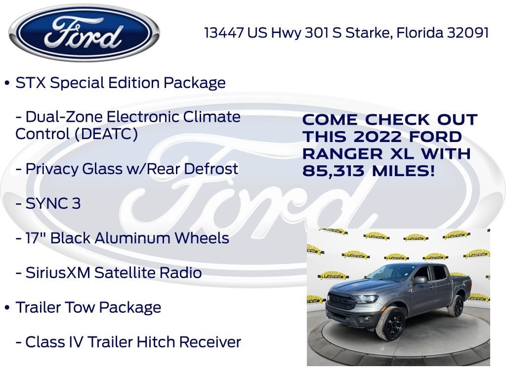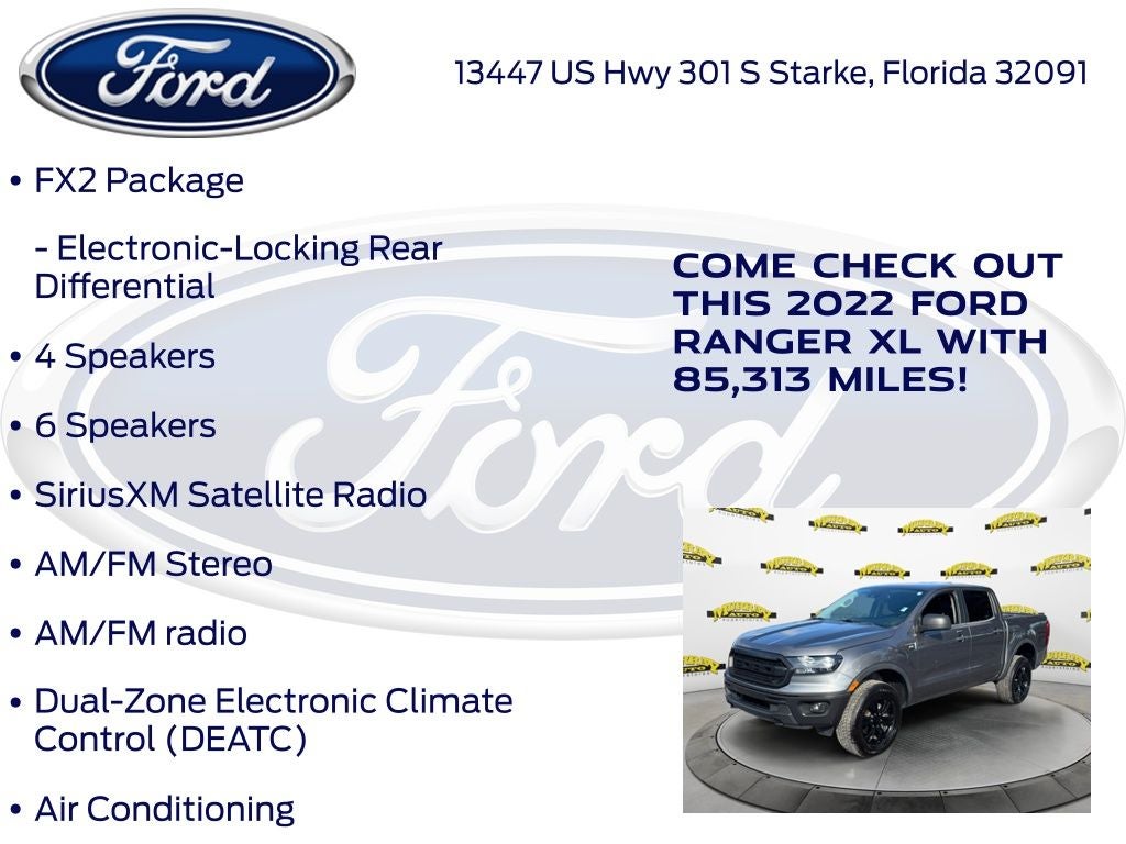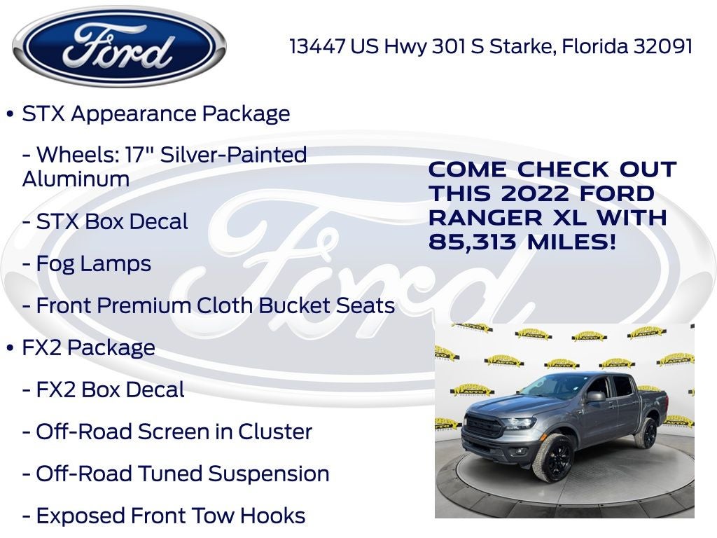 Recent Arrival! Murray Ford Superstore of Starke is pumped up to offer this robust, reliable 2022 Ford Ranger in Carbonized Gray Metallic This vehicle is readily available and comes with the following Equipment Group 101A High (6 Speakers, Cruise Control, Day/Night Rear-View Mirror, Perimeter Anti-Theft Alarm, Power Glass Sideview Mirrors, Remote Key Fob w/Tailgate Lock, and SYNC), FX2 Package (Electronic-Locking Rear Differential, Exposed Front Tow Hooks, FX2 Box Decal, Off-Road Screen in Cluster, and Off-Road Tuned Suspension), STX Appearance Package (Fog Lamps, Front Premium Cloth Bucket Seats, STX Box Decal, and Wheels: 17 Silver-Painted Aluminum), STX Special Edition Package (17 Black Aluminum Wheels, Dual-Zone Electronic Climate Control (DEATC), Privacy Glass w/Rear Defrost, SiriusXM Satellite Radio, and SYNC 3), Trailer Tow Package (Class IV Trailer Hitch Receiver), Ford Blue Certified Certified, 110V AC Power Outlet, 4 Speakers, 4-Wheel Disc Brakes, 5 Rectangular Black Running Boards, ABS brakes, Air Conditioning, AM/FM radio, AM/FM Stereo, Auto Start-Stop Technology, Auto-dimming Rear-View mirror, Body-Color SecuriCode Keyless-Entry Keypad, Brake assist, Carpet Flooring w/Floor Mats, Compass, Delay-off headlights, Driver door bin, Dual front impact airbags, Dual front side impact airbags, Electronic Stability Control, Exterior Parking Camera Rear, Front anti-roll bar, Front Bucket Seats, Front Center Armrest, Front Cloth Bucket Seats, Front wheel independent suspension, Fully automatic headlights, Gray Pixelated Graphics, Illuminated entry, Low tire pressure warning, Occupant sensing airbag, Overhead airbag, Passenger door bin, Pickup Box Extender, Power steering, Power windows, Rear seat center armrest, Rear step bumper, Speed-sensing steering, Steering wheel mounted audio controls, Telescoping steering wheel, Tilt steering wheel, Traction control, Trip computer, Variably intermittent wipers, Voltmeter, and Wheels: 16 Silver Steel;
