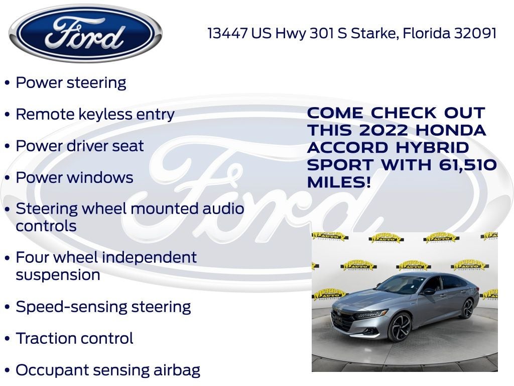 Recent Arrival! Murray Ford Superstore of Starke is proud to offer this handsome 2022 Honda Accord Hybrid in Lunar Silver Metallic This vehicle is readily available and comes with the following Ford Blue Advantage: Blue Certified Certified, 2.0L 4-Cylinder DOHC 16V i-VTEC, 4-Wheel Disc Brakes, 8 Speakers, ABS brakes, Adaptive Cruise Control: Adaptive Cruise Control (ACC) with Low-Speed Follow, Air Conditioning, Alloy wheels, AM/FM radio: SiriusXM, Apple CarPlay/Android Auto, Auto High-beam Headlights, Automatic temperature control, Brake assist, Bumpers: body-color, Delay-off headlights, Driver door bin, Driver vanity mirror, Dual front impact airbags, Dual front side impact airbags, Electronic Stability Control, Emergency communication system: HondaLink, Exterior Parking Camera Rear, Fabric w/Synthetic Leather Seat Trim, Forward collision: Collision Mitigation Braking System (CMBS) + FCW mitigation, Four wheel independent suspension, Front anti-roll bar, Front Bucket Seats, Front Center Armrest, Front dual zone A/C, Front fog lights, Front reading lights, Fully automatic headlights, Heated door mirrors, Heated front seats, Illuminated entry, Knee airbag, Lane Departure Warning System, Leather steering wheel, Low tire pressure warning, Occupant sensing airbag, Outside temperature display, Overhead airbag, Overhead console, Panic alarm, Passenger door bin, Passenger vanity mirror, Power door mirrors, Power driver seat, Power steering, Power windows, Radio data system, Radio: 180-Watt HD Audio System, Rear anti-roll bar, Rear seat center armrest, Rear window defroster, Remote keyless entry, Security system, Speed control, Speed-sensing steering, Speed-Sensitive Wipers, Split folding rear seat, Steering wheel mounted audio controls, Telescoping steering wheel, Tilt steering wheel, Traction control, Trip computer, Variably intermittent wipers, and Wheels: 19 Machine-Finished Alloy w/Black Inserts;