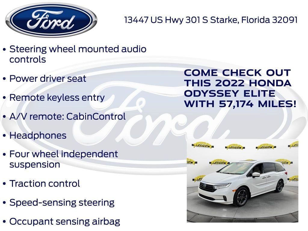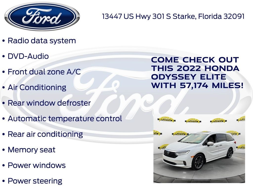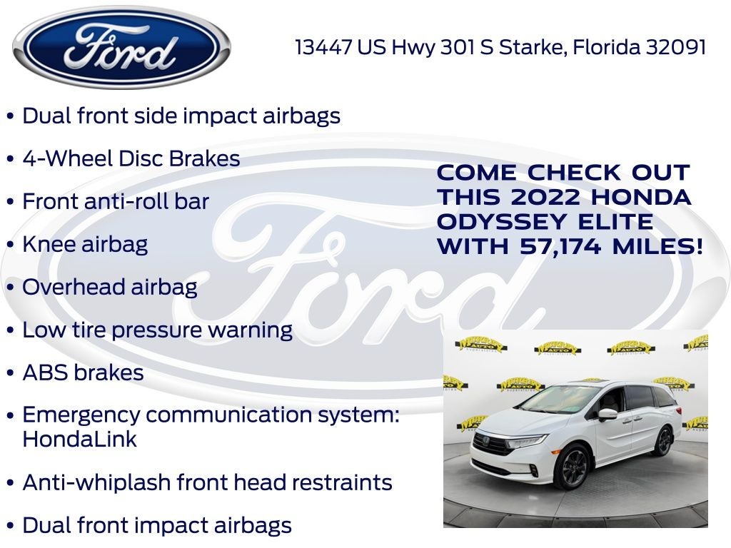 Odometer is 6099 miles below market average! Murray Ford Superstore of Starke is very proud to offer this fantastic 2022 Honda Odyssey in Platinum White This vehicle is readily available and comes with the following 11 Speakers, 3.61 Axle Ratio, 3rd row seats: split-bench, 4-Wheel Disc Brakes, A/V remote: CabinControl, ABS brakes, Adaptive Cruise Control: Adaptive Cruise Control (ACC) with Low-Speed Follow, Air Conditioning, Alloy wheels, AM/FM radio: SiriusXM, Anti-whiplash front head restraints, Apple CarPlay/Android Auto, Auto High-beam Headlights, Auto-dimming door mirrors, Auto-dimming Rear-View mirror, Automatic temperature control, Blind Spot Information (BSI) System warning, Brake assist, Bumpers: body-color, CD player, Compass, Delay-off headlights, Driver door bin, Driver vanity mirror, Driver's Seat Mounted Armrest, Dual front impact airbags, Dual front side impact airbags, DVD-Audio, Electronic Stability Control, Emergency communication system: HondaLink, Exterior Parking Camera Rear, Forward collision: Collision Mitigation Braking System (CMBS) + FCW mitigation, Four wheel independent suspension, Front anti-roll bar, Front Bucket Seats, Front dual zone A/C, Front fog lights, Front reading lights, Fully automatic headlights, Garage door transmitter: HomeLink, Headphones, Heated & Ventilated Front Bucket Seats, Heated door mirrors, Heated front seats, Heated steering wheel, Illuminated entry, Knee airbag, Lane departure: Lane Keeping Assist System (LKAS) active, Leather Seat Trim, Leather steering wheel, Low tire pressure warning, Memory seat, Navigation system: Honda Satellite-Linked Navigation System, Occupant sensing airbag, Outside temperature display, Overhead airbag, Overhead console, Panic alarm, Passenger door bin, Passenger seat mounted armrest, Passenger vanity mirror, Power door mirrors, Power driver seat, Power Liftgate, Power moonroof, Power passenger seat, Power steering, Power windows, Radio data system, Radio: 550-Watt AM/FM/HD Premium Audio System, Rain sensing wipers, Rear air conditioning, Rear anti-roll bar, Rear audio controls, Rear reading lights, Rear seat center armrest, Rear window defroster, Rear window wiper, Reclining 3rd row seat, Remote keyless entry, Security system, Speed control, Speed-sensing steering, Speed-Sensitive Wipers, Split folding rear seat, Spoiler, Steering wheel mounted audio controls, Tachometer, Telescoping steering wheel, Tilt steering wheel, Traction control, Trip computer, Turn signal indicator mirrors, Variably intermittent wipers, Ventilated front seats, and Wheels: 19 Unique Machine-Finished Alloy;