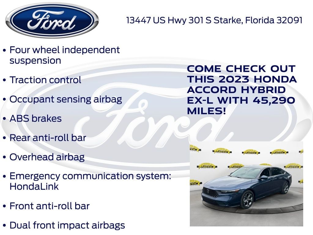 Recent Arrival! CARFAX One-Owner. Murray Ford Superstore of Starke is proud to offer this charming-looking 2023 Honda Accord Hybrid in Blue Metallic This vehicle is readily available and comes with the following Ford Blue Advantage: Blue Certified Certified, 2.0L 16V DOHC, 4-Wheel Disc Brakes, 8 Speakers, ABS brakes, Adaptive Cruise Control: Adaptive Cruise Control (ACC) with Low-Speed Follow, Air Conditioning, Alloy wheels, AM/FM radio, Apple CarPlay/Android Auto, Auto High-beam Headlights, Auto-dimming Rear-View mirror, Automatic temperature control, Brake assist, Bumpers: body-color, Compass, Delay-off headlights, Driver door bin, Driver vanity mirror, Dual front impact airbags, Dual front side impact airbags, Electronic Stability Control, Emergency communication system: HondaLink, Exterior Parking Camera Rear, Four wheel independent suspension, Front anti-roll bar, Front Bucket Seats, Front Center Armrest, Front dual zone A/C, Front reading lights, Fully automatic headlights, Heated door mirrors, Heated Front Bucket Seats, Heated front seats, Illuminated entry, Knee airbag, Lane departure: Lane Keeping Assist System (LKAS) active, Leather Shift Knob, Leather steering wheel, Leather-Trimmed Seat Trim, Low tire pressure warning, Memory seat, Occupant sensing airbag, Outside temperature display, Overhead airbag, Overhead console, Panic alarm, Passenger door bin, Passenger vanity mirror, Power door mirrors, Power driver seat, Power moonroof, Power passenger seat, Power steering, Power windows, Radio data system, Radio: 180-Watt Audio System, Rear anti-roll bar, Rear reading lights, Rear seat center armrest, Rear side impact airbag, Rear window defroster, Remote keyless entry, Security system, Speed control, Speed-sensing steering, Speed-Sensitive Wipers, Split folding rear seat, Steering wheel mounted audio controls, Telescoping steering wheel, Tilt steering wheel, Traction control, Trip computer, Turn signal indicator mirrors, Variably intermittent wipers, and Wheels: 17 x 7.5J Pewter Gray;