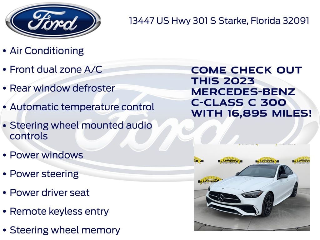 CARFAX One-Owner. Priced below KBB Fair Purchase Price! Odometer is 18880 miles below market average! Murray Ford Superstore of Starke is very proud to offer this fantastic 2023 Mercedes-Benz C-Class in MANUFAKTUR Diamond White Metallic This vehicle is readily available and comes with the following Premium Trim Package, 4MATIC®, 11.9 Center Touchscreen Display, 18 5-Spoke Wheels, 4-way Power Driver's Lumbar Support, 4-Wheel Disc Brakes, 5 Speakers, ABS brakes, Air Conditioning, Alloy wheels, AM/FM radio, Anti-whiplash front head restraints, Apple CarPlay®/Android Auto®, Auto High-beam Headlights, Auto tilt-away steering wheel, Auto-dimming door mirrors, Auto-dimming Rear-View mirror, Automatic temperature control, Brake assist, Bumpers: body-color, Child-Seat-Sensing Airbag, Compass, Delay-off headlights, Driver door bin, Driver vanity mirror, Dual front impact airbags, Dual front side impact airbags, Electronic Stability Control, Emergency communication system: Mercedes-Benz Emergency Call Service, Exterior Parking Camera Rear, Four wheel independent suspension, Front anti-roll bar, Front Bucket Seats, Front Center Armrest, Front dual zone A/C, Front reading lights, Fully automatic headlights, Garage door transmitter: HomeLink, Genuine wood dashboard insert, Head restraints memory, Heated door mirrors, Heated front seats, Illuminated entry, Knee airbag, Low tire pressure warning, MB-Tex Upholstery, Memory seat, Occupant sensing airbag, Outside temperature display, Overhead airbag, Overhead console, Panic alarm, Passenger door bin, Passenger vanity mirror, Power adjustable front head restraints, Power door mirrors, Power driver seat, Power Heated Front Seats w/Memory, Power moonroof, Power passenger seat, Power steering, Power windows, Premium audio system: MBUX, Radio data system, Radio: FrontBass 5-Speaker Audio System, Rain sensing wipers, Rear anti-roll bar, Rear fog lights, Rear reading lights, Rear seat center armrest, Rear window defroster, Remote keyless entry, Security system, Speed control, Speed-sensing steering, Split folding rear seat, Steering wheel memory, Steering wheel mounted audio controls, Tachometer, Telescoping steering wheel, Tilt steering wheel, Traction control, Trip computer, Turn signal indicator mirrors, Variably intermittent wipers, and Weather band radio;