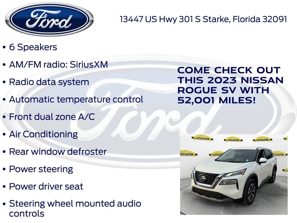 CARFAX One-Owner. Priced below KBB Fair Purchase Price! Murray Ford Superstore of Starke is pumped up to offer this outstanding 2023 Nissan Rogue in Pearl White Tricoat This vehicle is readily available and comes with the following AWD, 18 Aluminum Alloy Wheels, 4-Wheel Disc Brakes, 5.604 Axle Ratio, 6 Speakers, ABS brakes, Air Conditioning, Alloy wheels, AM/FM Radio, AM/FM radio: SiriusXM, Auto High-beam Headlights, Automatic temperature control, Brake assist, Bumpers: body-color, Cloth Seat Trim, Delay-off headlights, Driver door bin, Driver vanity mirror, Dual front impact airbags, Dual front side impact airbags, Electronic Stability Control, Emergency communication system: NissanConnect Services, First Aid Kit, Floor Mats w/1-Piece Cargo Area Protector, Four wheel independent suspension, Front anti-roll bar, Front Bucket Seats, Front Center Armrest, Front dual zone A/C, Front reading lights, Fully automatic headlights, Heated door mirrors, Illuminated entry, Knee airbag, Low tire pressure warning, NissanConnect featuring Apple CarPlay and Android Auto, Occupant sensing airbag, Outside temperature display, Overhead airbag, Overhead console, Panic alarm, Passenger door bin, Passenger vanity mirror, Power door mirrors, Power driver seat, Power steering, Power windows, Radio data system, Rear anti-roll bar, Rear Parking Sensors, Rear seat center armrest, Rear side impact airbag, Rear window defroster, Rear window wiper, Remote keyless entry, Speed control, Speed-Sensitive Wipers, Split folding rear seat, Spoiler, Steering wheel mounted audio controls, Tachometer, Telescoping steering wheel, Tilt steering wheel, Traction control, Trip computer, and Variably intermittent wipers;