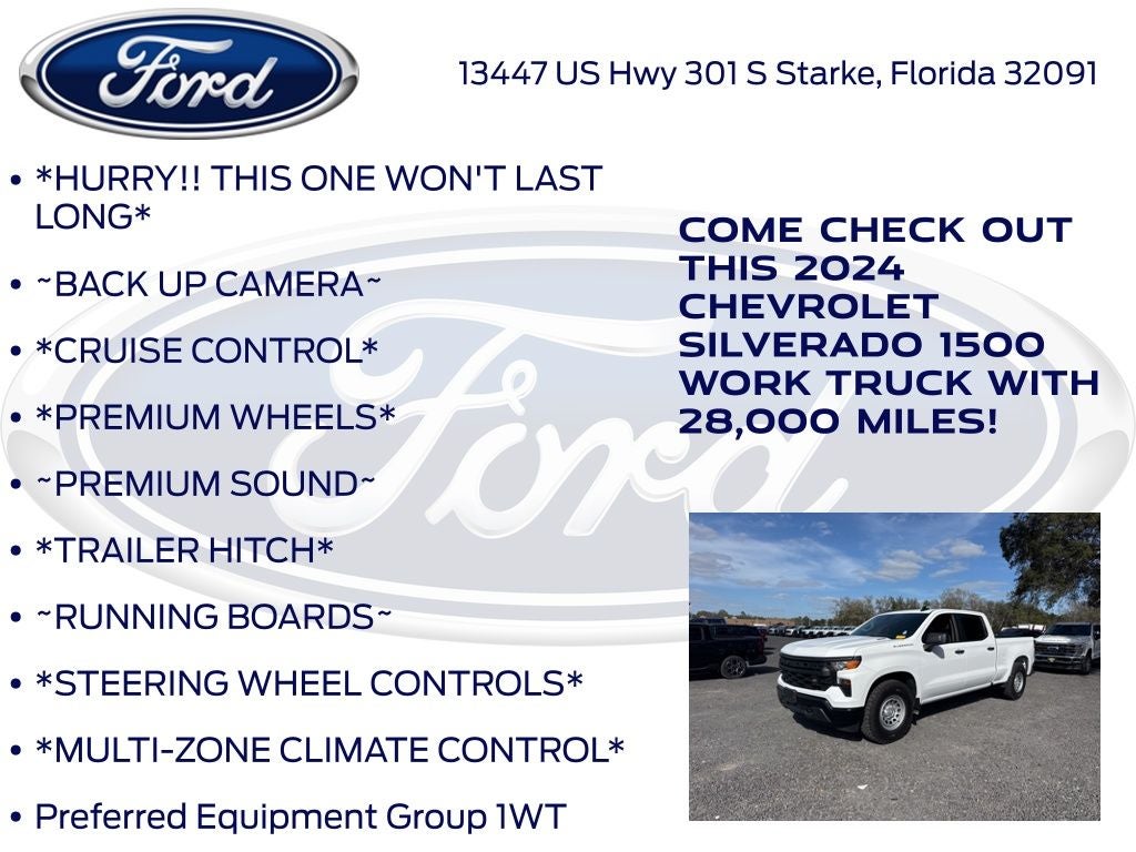 Recent Arrival! CARFAX One-Owner. Priced below KBB Fair Purchase Price! Murray Ford Superstore of Starke is excited to offer this stout 2024 Chevrolet Silverado 1500 in Summit White This vehicle is readily available and comes with the following Preferred Equipment Group 1WT (3.5 Monochromatic Display Driver Info Center, Black (Semi-Gloss) Front Bumper, Black (Semi-Gloss) Rear Bumper, Black Manual Outside Mirrors, Bluetooth® For Phone, Chevrolet Connected Access Capable, Electrical Steering Column Lock, Front Frame-Mounted Black Recovery Hooks, HD Rear Vision Camera, Inside Rear-View Mirror w/Tilt, Locking Tailgate, Manual Tailgate Function w/No EZ Lift, Manual Tilt Wheel Steering Column, OnStar & Chevrolet Connected Services Capable, Power Front Windows w/Driver Express Up/Down, Power Front Windows w/Passenger Express Down, Power Rear Windows w/Express Down, Rear 60/40 Folding Bench Seat (Folds Up), Remote Keyless Entry, Rubberized-Vinyl Floor Covering, SiriusXM Delete, Solar Absorbing Tinted Glass, Standard Tailgate, and Wi-Fi Hot Spot Capable), Standard Suspension Package, WT Convenience Package (Deep-Tinted Glass, Electric Rear-Window Defogger, Electronic Cruise Control, and Heated Power-Adjustable Outside Mirrors), 8-Speed Automatic, Jet Black Vinyl, 220 Amp Alternator, 3.42 Rear Axle Ratio, 4-Wheel Disc Brakes, 40/20/40 Front Split-Bench Seat, 6 Speakers, 6-Speaker Audio System, ABS brakes, Air Conditioning, Auto High-beam Headlights, Automatic Emergency Braking, Brake assist, Chevytec Spray-On Black Bedliner, Compass, Delay-off headlights, Driver door bin, Dual front impact airbags, Dual front side impact airbags, Electronic Stability Control, Following Distance Indicator, Forward Collision Alert, Front anti-roll bar, Front Center Armrest w/Storage, Front Pedestrian Braking, Front reading lights, Front wheel independent suspension, Fully automatic headlights, Illuminated entry, IntelliBeam Automatic High Beam On/Off, Lane Keep Assist w/Lane Departure Warning, Low tire pressure warning, Occupant sensing airbag, Outside temperature display, Overhead airbag, Overhead console, Panic alarm, Passenger door bin, Passenger vanity mirror, Power steering, Power windows, Premium audio system: Chevrolet Infotainment 3, Radio data system, Radio: Chevrolet Infotainment 3 System, Rear reading lights, Rear step bumper, Remote keyless entry, Speed-sensing steering, Split folding rear seat, Tachometer, Tilt steering wheel, Traction control, Trip computer, Variably intermittent wipers, Vinyl Seat Trim, Voltmeter, and Wheels: 17 x 8 Ultra Silver Painted Steel;