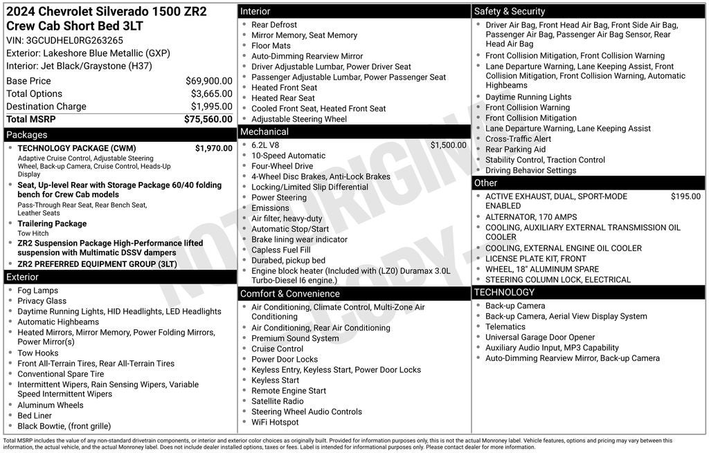 Recent Arrival! CARFAX One-Owner. Murray Ford Superstore of Starke is pleased to offer this reliable 2024 Chevrolet Silverado 1500 in Lakeshore Blue Metallic This vehicle is readily available and comes with the following Preferred Equipment Group 3LT (10-Way Power Driver Seat w/Lumbar, 10-Way Power Passenger Seat Adjuster w/Lumbar, 12.3 Multicolor Reconfigurable Digital Display, 120-Volt Bed Mounted Power Outlet, 120-Volt Interior Power Outlet, 2 USB Data Ports, 2nd Row Heated Outboard Seats, All-Weather Floor Liner (LPO), Auto-Dimming Inside Rear-View Mirror, Bed View Camera, Bluetooth® For Phone, Chevrolet Connected Access Capable, Chevytec Spray-On Black Bedliner, Color-Keyed Carpeting Floor Covering, Deep-Tinted Glass, Driver Memory, Dual Rear USB Ports (Charge Only), Electric Rear-Window Defogger, Electrical Steering Column Lock, Electronic Cruise Control, EZ Lift Power Lock & Release Tailgate, Floor Mounted Center Console, Front LED Fog Lamps, Front Rain-Sensing Wipers, HD Surround Vision, Heated Driver & Front Outboard Passenger Seats, Heated Steering Wheel, Heavy-Duty Air Filter, High Gloss Black Mirror Caps, Hill Descent Control, Hitch Guidance w/Hitch View, In-Vehicle Trailering System App, Integrated Trailer Brake Controller, Keyless Open & Start, LED Cargo Area Lighting, Manual Tilt/Telescoping Steering Column, OnStar & Chevrolet Connected Services Capable, Outside Heated Power-Adjustable Mirrors, Performance Red Recovery Hooks, Perimeter Lighting, Power Front Passenger Windows w/Express Up/Down, Power Front Windows w/Driver Express Up/Down, Power Rear Windows w/Express Down, Power Sliding Rear Window w/Rear Defogger, Rear Cross Traffic Braking, Rear Park Assist, Rear Pedestrian Alert, Rear Wheelhouse Liners, Remote Vehicle Starter System, Safety Alert Seat, SiriusXM w/360L, Standard Tailgate, Steering Wheel Audio Controls, Theft Deterrent System (Unauthorized Entry), Trailer Camera Provisions, Trailer Side Blind Zone Alert, Universal Home Remote, Ventilated Driver & Front Passenger Seats, Wi-Fi Hot Spot Capable, and Wrapped Steering Wheel), Technology Package (15 Diagonal Multicolor Head-Up Display, Adaptive Cruise Control, Power Tilt & Telescoping Steering Column, and Rear Camera Mirror), Trailering Package (Hitch Guidance), Up-Level Rear Seat w/Storage Package, ZR2 Suspension Package, 10-Speed Automatic, 4WD, Jet Black/Graystone Leather, 170 Amp Alternator, 220 Amp Alternator, 3.23 Rear Axle Ratio, 4-Wheel Disc Brakes, 7 Speakers, 850 Cold-Cranking Amps Heavy-Duty Battery, ABS brakes, Air Conditioning, Alloy wheels, AM/FM radio: SiriusXM with 360L, Auto High-beam Headlights, Auto-dimming door mirrors, Auto-dimming Rear-View mirror, Automatic Emergency Braking, Automatic temperature control, Auxiliary External Transmission Oil Cooler, Block heater, Brake assist, Compass, Delay-off headlights, Driver door bin, Driver vanity mirror, Dual Active Exhaust, Dual Exhaust, Dual front impact airbags, Dual front side impact airbags, Electronic Stability Control, Electronic Transmission Range Selector Shifter, Engine Block Heater, External Engine Oil Cooler, Following Distance Indicator, Forward Collision Alert, Front anti-roll bar, Front Bucket Seats, Front Center Armrest, Front dual zone A/C, Front fog lights, Front License Plate Kit, Front Pedestrian Braking, Front reading lights, Front wheel independent suspension, Fully automatic headlights, Garage door transmitter, Heated door mirrors, Heated front seats, Heated rear seats, Heated steering wheel, Illuminated entry, IntelliBeam Automatic High Beam On/Off, Lane Keep Assist w/Lane Departure Warning, Low tire pressure warning, Memory seat, Occupant sensing airbag, Outside temperature display, Overhead airbag, Overhead console, Panic alarm, Passenger door bin, Passenger vanity mirror, Perforated Leather Seat Trim, Power door mirrors, Power driver seat, Power passenger seat, Power steering, Power windows, Premium audio system: Chevrolet Infotainment 3 Premium, Premium Bo