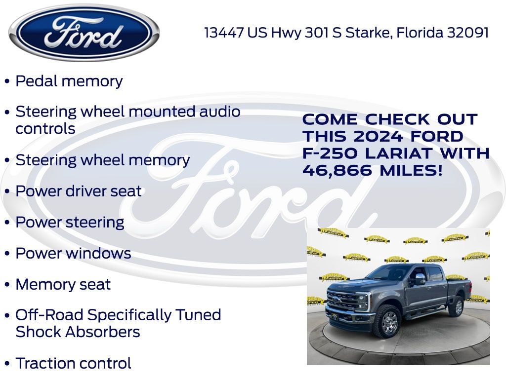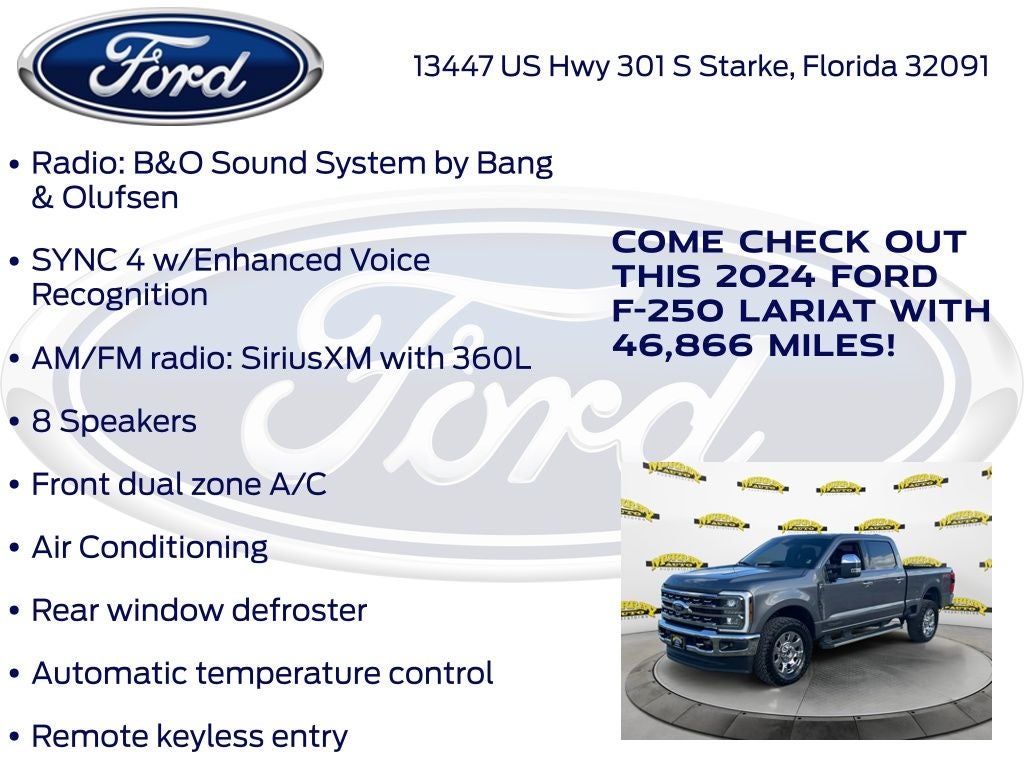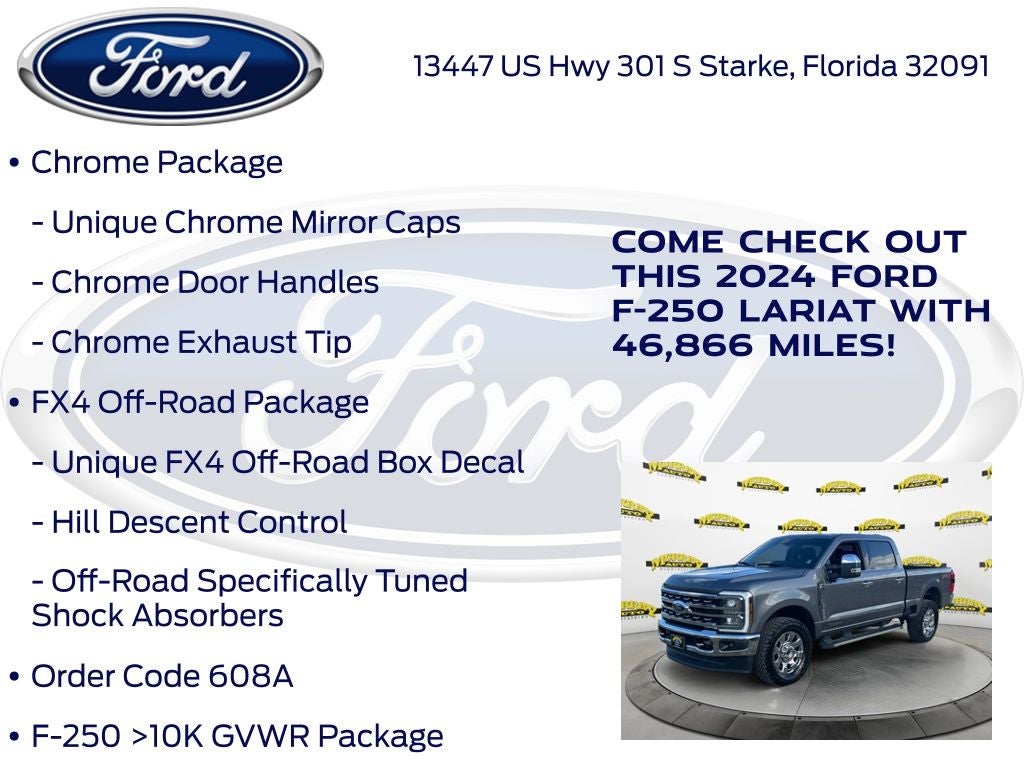Recent Arrival! CARFAX One-Owner. Murray Ford Superstore of Starke is pumped up to offer this stout 2024 Ford F-250SD in Carbonized Gray Metallic This vehicle is readily available and comes with the following Chrome Package (6 Angular Bright Anodized Step Bars, Chrome Door Handles, Chrome Exhaust Tip, Unique Chrome Mirror Caps, and Wheels: 20 Chrome PVD Aluminum), F-250 >10K GVWR Package, FX4 Off-Road Package (Hill Descent Control, Off-Road Specifically Tuned Shock Absorbers, and Unique FX4 Off-Road Box Decal), Order Code 608A, Ford Gold Certified Certified, 4WD, 190 Amp Alternator, 4-Wheel Disc Brakes, 8 Speakers, ABS brakes, Adjustable pedals, Air Conditioning, Alloy wheels, AM/FM radio: SiriusXM with 360L, Auto High-beam Headlights, Auto tilt-away steering wheel, Auto-dimming Rear-View mirror, Automatic temperature control, Brake assist, Bumpers: chrome, Compass, Customer-Placed Trailer Camera, Delay-off headlights, Driver door bin, Driver vanity mirror, Dual 68 AH/65 AGM Batteries, Dual front impact airbags, Dual front side impact airbags, Electronic Stability Control, Electronic-Locking w/3.31 Axle Ratio, Emergency communication system: SYNC 4 911 Assist, Exterior Parking Camera Rear, Flow-Through Console, Front anti-roll bar, Front Bucket Seats, Front Center Armrest, Front dual zone A/C, Front fog lights, Front Leather-Trimmed 40/Console/40 Seats, Front reading lights, Fully automatic headlights, Garage door transmitter, Heated door mirrors, Heated front seats, Heated rear seats, Heated steering wheel, Illuminated entry, Leather steering wheel, Low tire pressure warning, Memory seat, Navigation system: Connected Navigation (includes complimentary 1-year trial), Outside temperature display, Overhead airbag, Overhead console, Panic alarm, Passenger door bin, Passenger vanity mirror, Pedal memory, Power door mirrors, Power driver seat, Power passenger seat, Power steering, Power windows, Radio: B&O Sound System by Bang & Olufsen, Rain sensing wipers, Rear reading lights, Rear seat center armrest, Rear step bumper, Rear window defroster, Remote keyless entry, Security system, SiriusXM Radio w/360L, Speed control, Split folding rear seat, Steering wheel memory, Steering wheel mounted audio controls, SYNC 4 w/Enhanced Voice Recognition, Tachometer, Tailgate Step & Handle, Telescoping steering wheel, Tilt steering wheel, Traction control, Trip computer, Turn signal indicator mirrors, Upfitter Switches (6), Variably intermittent wipers, Ventilated front seats, and Wheels: 18 Bright Machined & Carbonized Gray Alum;
