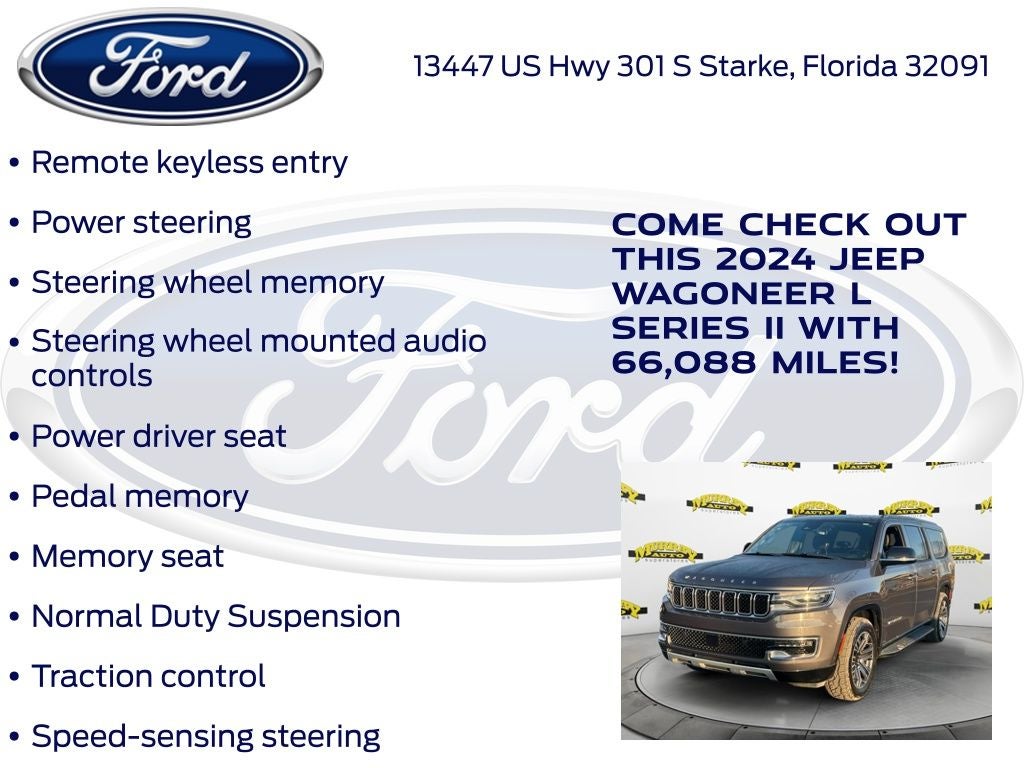 CARFAX One-Owner. Priced below KBB Fair Purchase Price! Murray Ford Superstore of Starke is proud to offer this wonderful-looking 2024 Jeep Wagoneer L in Baltic Gray Metallic Clearcoat This vehicle is readily available and comes with the following Flexible Seating Group (7-Passenger Seating, Floor Console w/Cupholder, and Power Tip/Slide Recline 2nd Row Buckets), Quick Order Package 25J, 10 Speakers, 3.55 Rear Axle Ratio, 3rd row seats: bench, 4-Wheel Disc Brakes, ABS brakes, Adjustable pedals, Air Conditioning, Alloy wheels, AM/FM radio: SiriusXM with 360L, Anti-whiplash front head restraints, Apple CarPlay/Android Auto, Audio memory, Auto-dimming door mirrors, Auto-dimming Rear-View mirror, Auto-leveling suspension, Automatic temperature control, Brake assist, Bumpers: body-color, Compass, Delay-off headlights, Driver door bin, Driver vanity mirror, Driver's Seat Mounted Armrest, Dual front impact airbags, Dual front side impact airbags, Electronic Stability Control, Emergency communication system: Wagoneer Connect, Exterior Parking Camera Rear, Four wheel independent suspension, Front anti-roll bar, Front Bucket Seats, Front Center Armrest w/Storage, Front dual zone A/C, Front fog lights, Front reading lights, Fully automatic headlights, Garage door transmitter, Genuine wood console insert, Genuine wood dashboard insert, Genuine wood door panel insert, Heated door mirrors, Heated front seats, Heated steering wheel, Illuminated entry, Knee airbag, Leather Trimmed Bucket Seats, Low tire pressure warning, Memory seat, Navigation System, Normal Duty Suspension, Occupant sensing airbag, Outside temperature display, Overhead airbag, Overhead console, Panic alarm, Passenger door bin, Passenger seat mounted armrest, Passenger vanity mirror, Pedal memory, Power adjustable front head restraints, Power door mirrors, Power driver seat, Power Liftgate, Power passenger seat, Power steering, Power windows, Radio data system, Radio: Uconnect 5 Nav w/10.1 Display, Rain sensing wipers, Rear air conditioning, Rear anti-roll bar, Rear reading lights, Rear seat center armrest, Rear window defroster, Rear window wiper, Reclining 3rd row seat, Remote keyless entry, Security system, Speed control, Speed-sensing steering, Speed-Sensitive Wipers, Split folding rear seat, Steering wheel memory, Steering wheel mounted audio controls, Tachometer, Telescoping steering wheel, Tilt steering wheel, Traction control, Trip computer, Turn signal indicator mirrors, Variably intermittent wipers, Ventilated front seats, Voltmeter, and Wheels: 20 x 9.0 Premium 2 Aluminum;