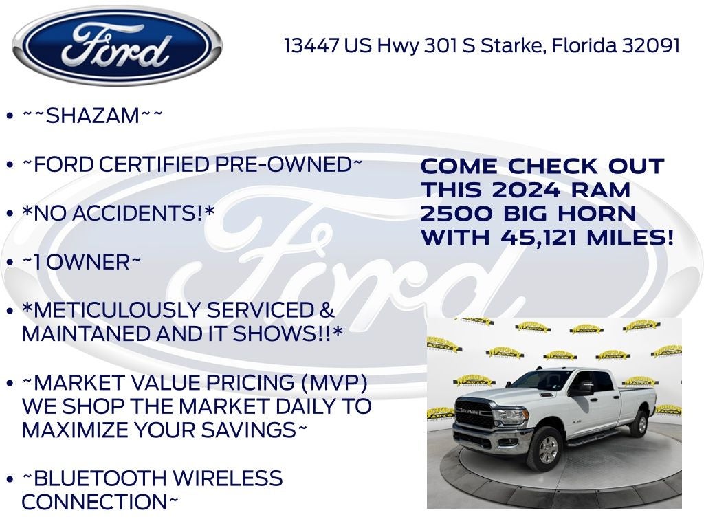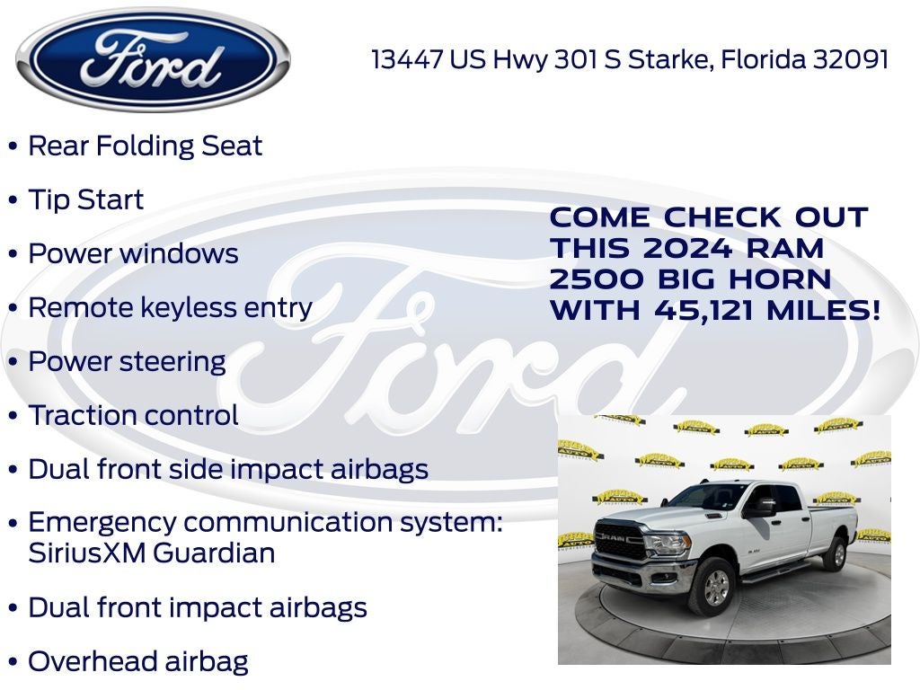 CARFAX One-Owner. Murray Ford Superstore of Starke is pleased to offer this attractive-looking 2024 Ram 2500 in Bright White Clearcoat This vehicle is readily available and comes with the following Ford Blue Advantage: Blue Certified Certified, 2 Way Rear Headrest Seat, 3.73 Axle Ratio, 4 Way Front Headrests, 4-Wheel Disc Brakes, 40/20/40 Split Bench Seat, 6 Speakers, ABS brakes, Active Noise Control System, Air Conditioning, Black Exterior Mirrors, Bluetooth® Handsfree Phone & Audio, Brake assist, Bumpers: chrome, Center Hub, Center Stack Storage Drawer, Cloth 40/20/40 Bench Seat, Compass, Connectivity - US/Canada, Delay-off headlights, Driver door bin, Dual front impact airbags, Dual front side impact airbags, Electronic Stability Control, Electronically Controlled Throttle, Emergency communication system: SiriusXM Guardian, Exterior Mirrors w/Heating Element, Front anti-roll bar, Front Armrest w/Cupholders, Front Center Armrest w/Storage, Front reading lights, Fully automatic headlights, Global Telematics Box Module (TBM), GPS Antenna Input, Heated door mirrors, Illuminated entry, Integrated Center Stack Radio, Integrated Voice Command w/Bluetooth®, Low tire pressure warning, Manual Adjust 4-Way Driver Seat, Manual Adjust 4-Way Front Passenger Seat, Mirror Running Lights, Occupant sensing airbag, Outside temperature display, Overhead airbag, Overhead console, Panic alarm, ParkView Rear Back-Up Camera, Passenger door bin, Passenger vanity mirror, Power Adjust Mirrors, Power door mirrors, Power steering, Power windows, Radio data system, Radio: Uconnect 3 w/5 Display, Rear anti-roll bar, Rear Folding Seat, Rear seat center armrest, Rear step bumper, Remote keyless entry, Remote USB Port - Charge Only, SiriusXM Radio Service, Speed control, Storage Tray, Tachometer, Tilt steering wheel, Tip Start, Traction control, Trip computer, Turn signal indicator mirrors, Variably intermittent wipers, Voltmeter, and Wheels: 18 x 8.0 Steel Chrome Clad;