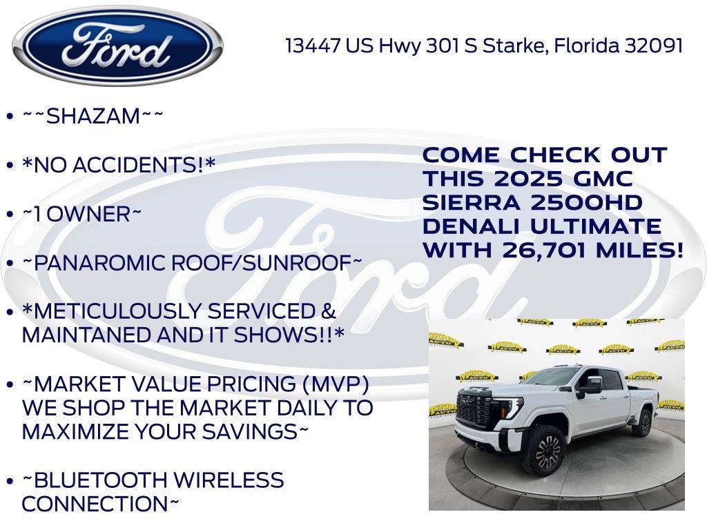 CARFAX One-Owner. Murray Ford Superstore of Starke is proud to offer this good-looking 2025 GMC Sierra 2500HD in White Frost Tricoat This vehicle is readily available and comes with the following Preferred Equipment Group 5SB (120-Volt Bed Mounted Power Outlet, 120-Volt Instrument Panel Power Outlet, 2 Charge-Only Rear USB Ports, 2 Charge/Data USB Ports Inside Center Console, 2 USB Ports, 2-Speed Active Transfer Case, Bed View Camera w/2 Trailer Camera Provisions, Bose Premium Series 12-Speaker System, Deep-Tinted Glass, Electric Rear-Window Defogger, Floor-Mounted Center Console, Front Rain-Sensing Wipers, HD Surround Vision, Heated 2nd Row Outboard Seats, Heated Driver & Front Outboard Passenger Seats, Keyless Open & Start, LED Cargo Area Lighting, LED Smoked Amber Roof Marker Lamps, Manual Tilt-Wheel/Telescoping Steering Column, OnStar Services Capable, Power Front Passenger Windows w/Express Up/Down, Power Sliding Rear Window w/Defogger, Power Sunroof, Push Button Start, Rear Cross Traffic Alert, Rear Wheelhouse Liners, Remote Vehicle Starter System, Safety Alert Seat, Signature Denali Ultimate Grille in Vadar Chrome, SiriusXM w/360L Trial Subscription, Spray-On Pickup Bedliner w/GMC Logo, Steering Wheel Audio Controls, Trailer Cam Provisions & Trailer Viewing Software, Trailer Side Blind Zone Alert, Trailer Tire Pressure Monitor Sensors, Ultrasonic Front & Rear Park Assist, Unauthorized Entry Theft-Deterrent System, Universal Home Remote, Ventilated Driver & Front Passenger Seats, Wireless Charging, and Wireless Phone Projection), Technology Package (Inside Rearview Auto-Dimming Rear Camera Mirror and Multicolor 15 Diagonal Head-Up Display), X31 Off-Road Package (Hill Descent Control), 10-Speed Automatic, 4WD, Alpine Umber Leather, 12 Speakers, 16-Way Power Driver Seat Adjuster w/Lumbar, 16-Way Power Passenger Seat Adjuster w/Lumbar, 220-Amp Alternator, 3.42 Axle Ratio, 4-Wheel Disc Brakes, ABS brakes, Air Conditioning, Alloy wheels, AM/FM radio: SiriusXM with 360L, Apple CarPlay/Android Auto, Auto High-beam Headlights, Auto-dimming door mirrors, Auto-dimming Rear-View mirror, Automatic Emergency Braking, Automatic temperature control, Block heater, Brake assist, Buckle to Drive, Bumpers: body-color, Compass, Delay-off headlights, Driver door bin, Driver Memory, Driver vanity mirror, Dual front impact airbags, Dual front side impact airbags, Dual Heavy-Duty 70 Amp Battery, Electronic Stability Control, Emergency communication system: OnStar, Following Distance Indicator, Forward Collision Alert, Front anti-roll bar, Front Bucket Seats, Front Center Armrest, Front dual zone A/C, Front fog lights, Front Pedestrian Braking, Front reading lights, Front wheel independent suspension, Full Grain Leather Seat Trim, Fully automatic headlights, Garage door transmitter, Genuine wood dashboard insert, Genuine wood door panel insert, Heads-Up Display, Heated door mirrors, Heated front seats, Heated rear seats, Heated steering wheel, Hitch Guidance w/Hitch View, Illuminated entry, In-Vehicle Trailering System App, IntelliBeam Automatic High Beam On/Off, Lane Departure Warning System, Leather steering wheel, Low tire pressure warning, Memory seat, Occupant sensing airbag, Off-Road Suspension, Outside temperature display, Overhead airbag, Overhead console, Panic alarm, Passenger door bin, Passenger vanity mirror, Pickup Box, Power door mirrors, Power driver seat, Power moonroof, Power passenger seat, Power steering, Power windows, Radio: AM/FM w/Premium GMC Infotainment System, Rain sensing wipers, Rear reading lights, Rear seat center armrest, Rear step bumper, Rear window defroster, Remote keyless entry, Security system, Speed control, Speed-sensing steering, Split folding rear seat, Steering wheel mounted audio controls, Tachometer, Telescoping steering wheel, Tilt steering wheel, Traction control, Trip computer, Turn signal indicator mirrors, Variably intermittent wipers, Ventilated front seats, Voltmeter, and Wheels: 20 Ultra-Brig