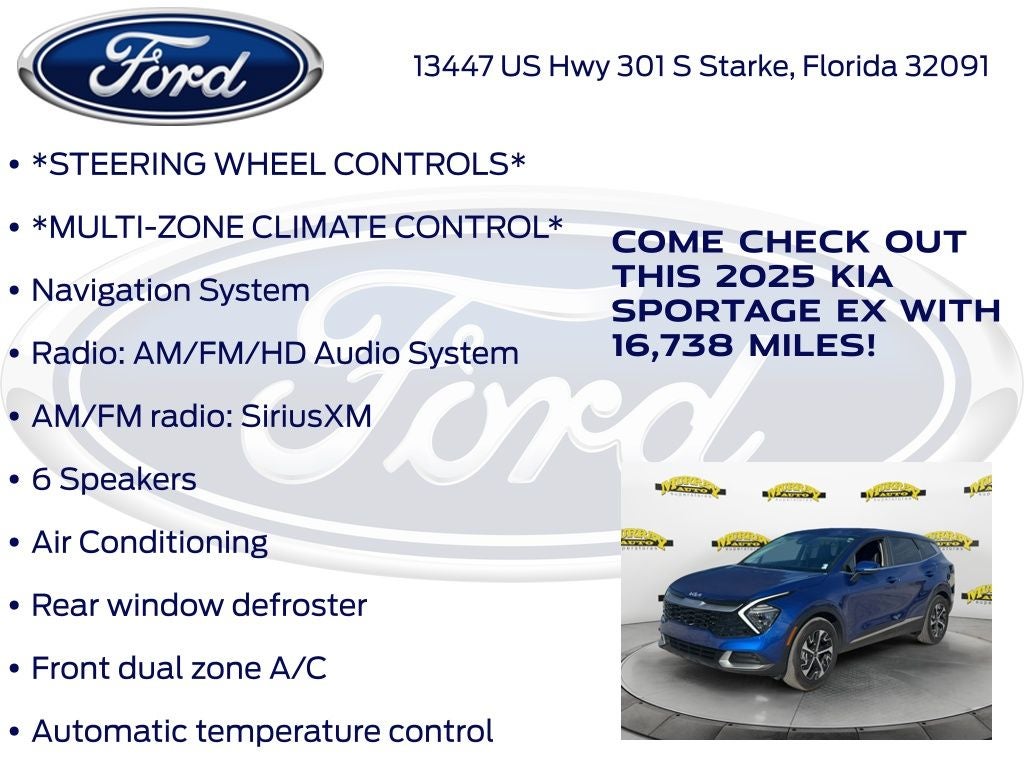 CARFAX One-Owner. Priced below KBB Fair Purchase Price! Murray Ford Superstore of Starke is excited to offer this fantastic-looking 2025 Kia Sportage in Sapphire Blue This vehicle is readily available and comes with the following 4-Wheel Disc Brakes, 6 Speakers, ABS brakes, Air Conditioning, Alloy wheels, AM/FM radio: SiriusXM, Apple CarPlay & Android Auto, Auto High-beam Headlights, Automatic temperature control, Brake assist, Bumpers: body-color, Carpeted Floor Mats, Compass, Delay-off headlights, Driver door bin, Driver vanity mirror, Dual front impact airbags, Dual front side impact airbags, Electronic Stability Control, Emergency communication system, Four wheel independent suspension, Front anti-roll bar, Front Bucket Seats, Front Center Armrest, Front dual zone A/C, Fully automatic headlights, Heated door mirrors, Heated Front Bucket Seats, Heated front seats, Illuminated entry, Leather Shift Knob, Leather steering wheel, Leatherette Seat Trim, Low tire pressure warning, Navigation System, Occupant sensing airbag, Outside temperature display, Overhead airbag, Overhead console, Panic alarm, Passenger door bin, Passenger vanity mirror, Power door mirrors, Power driver seat, Power steering, Power windows, Radio: AM/FM/HD Audio System, Rain sensing wipers, Rear anti-roll bar, Rear seat center armrest, Rear side impact airbag, Rear window defroster, Rear window wiper, Remote keyless entry, Security system, Speed control, Speed-sensing steering, Split folding rear seat, Spoiler, Steering wheel mounted audio controls, Tachometer, Telescoping steering wheel, Tilt steering wheel, Traction control, Trip computer, Turn signal indicator mirrors, Variably intermittent wipers, and Wheels: 18 x 7.5J Machined Alloy;